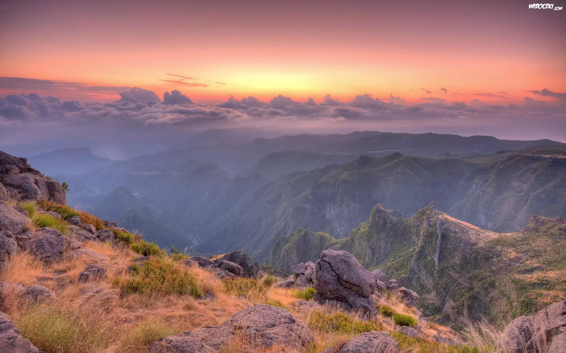 Góry, Porośnięte, Trawą, Mgła, Chmury, Wschód, Słońca