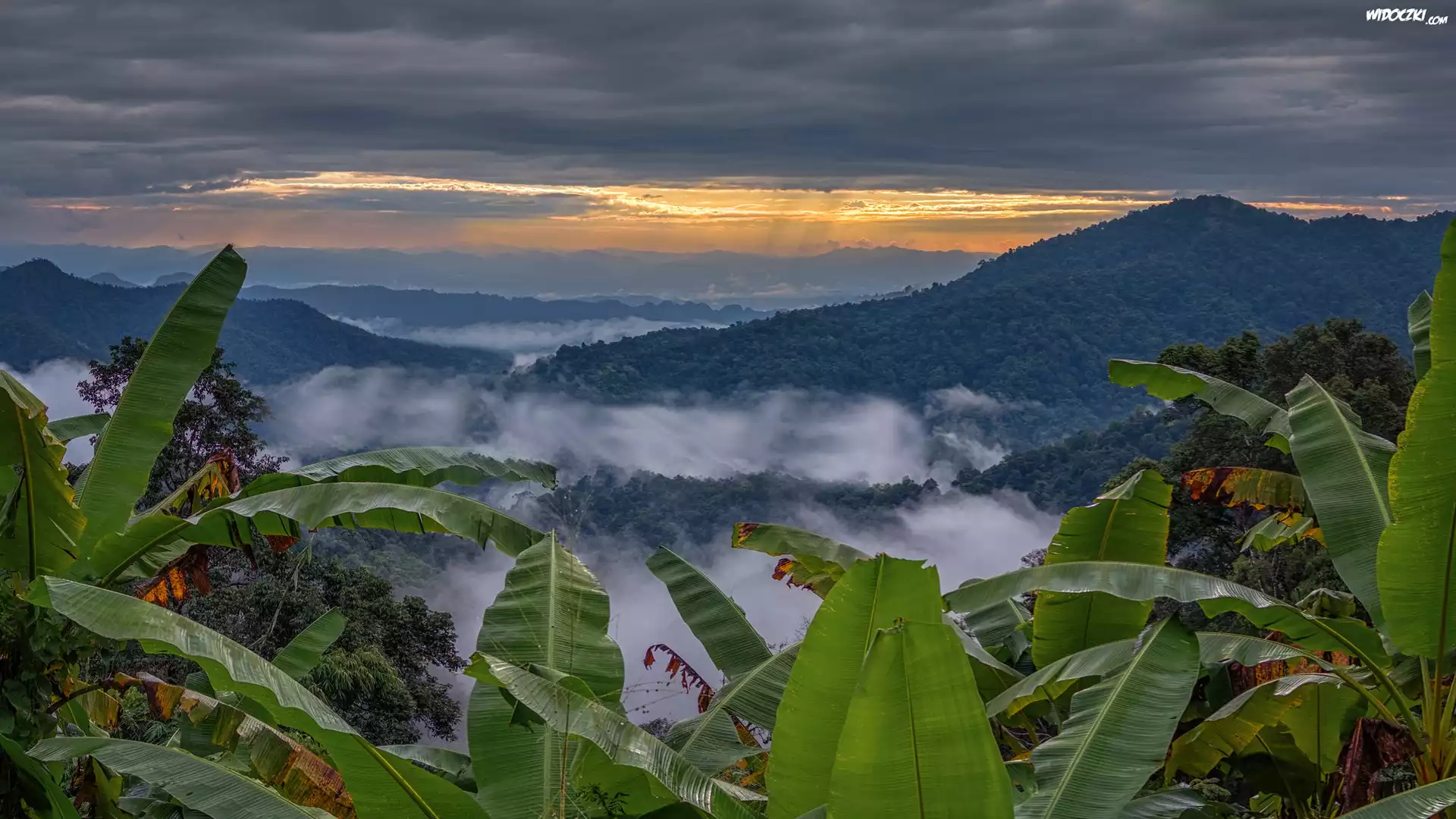 Zdjęcia, Porośnięte, Góry, Mgła, Listki, Chmury