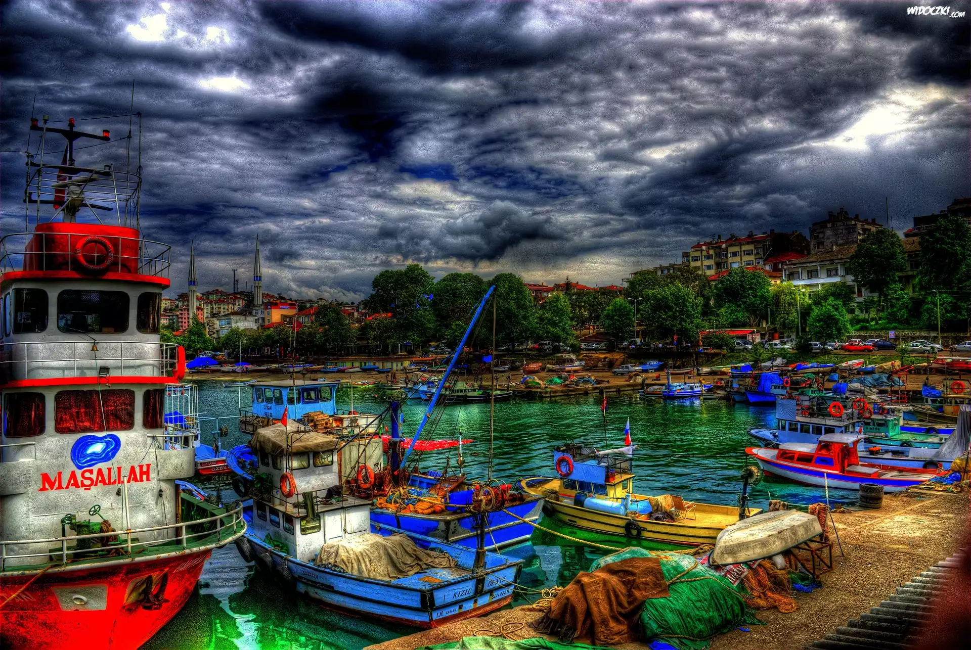 Zdjęcia, Port, Motorówki, Kutry, Chmury, Turcja