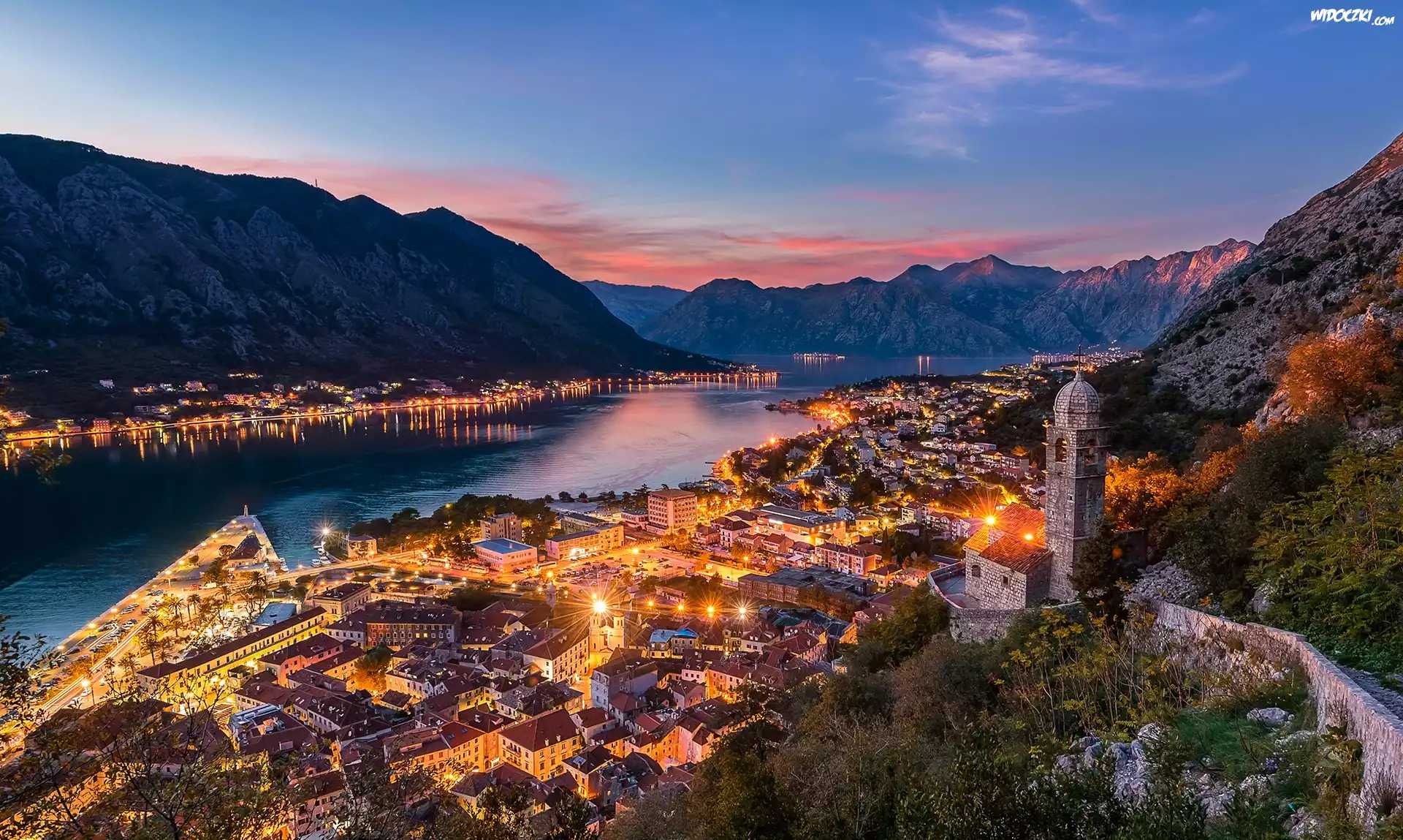 Zdjęcia, Góry, Przystań Porto Montenegro, Miasteczko Tivat, Domy, Światła, Zatoka Kotorska, Czarnogóra