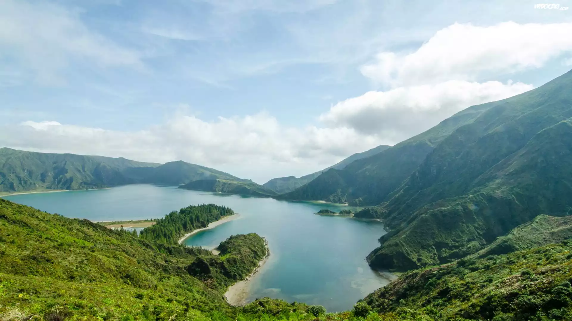 Zdjęcia, Jezioro, Lagoa do Fogo, Góry, Chmury, Drzewa, Portugalia