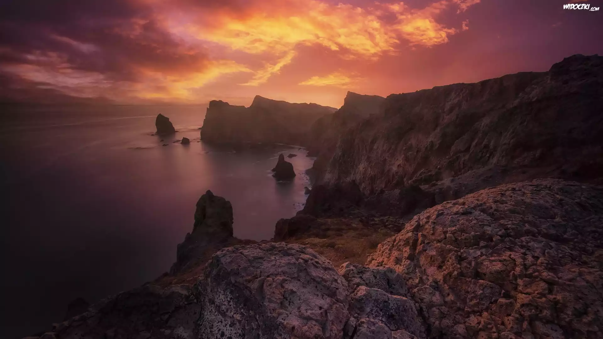 Morze, Wybrzeże, Klify, Skały, Zachód słońca, Chmury, Madera, Portugalia