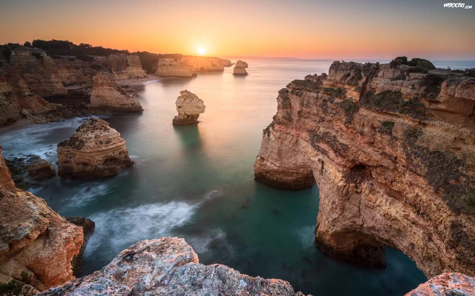 Zdjęcia, Wybrzeże, Skały, WSchód słońca, Morze, Region Algarve, Portugalia