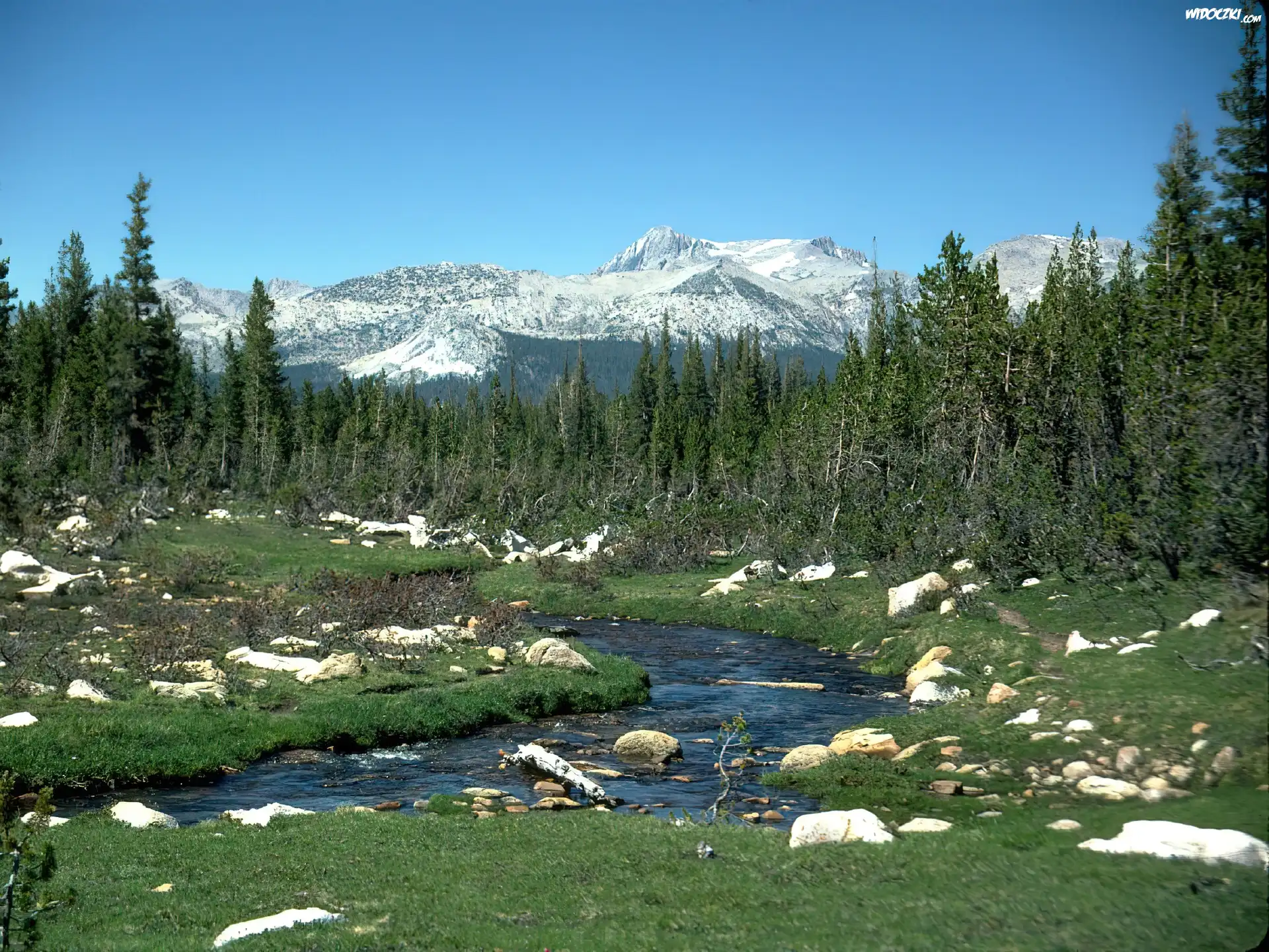 Zdjęcia, Potok, Górski, Trawa, Kamienie, Drzewa, Góry