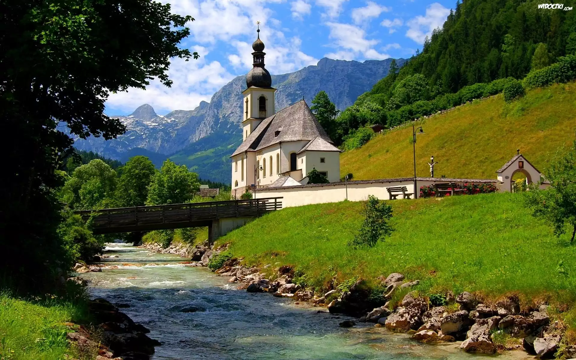 Niemcy, Bawaria, Park Narodowy Berchtesgaden, Ramsau bei Berchtesgaden, Góry Alpy, Kościół św. Sebastiana, Rzeka Ramsauer Ache, Mostek |