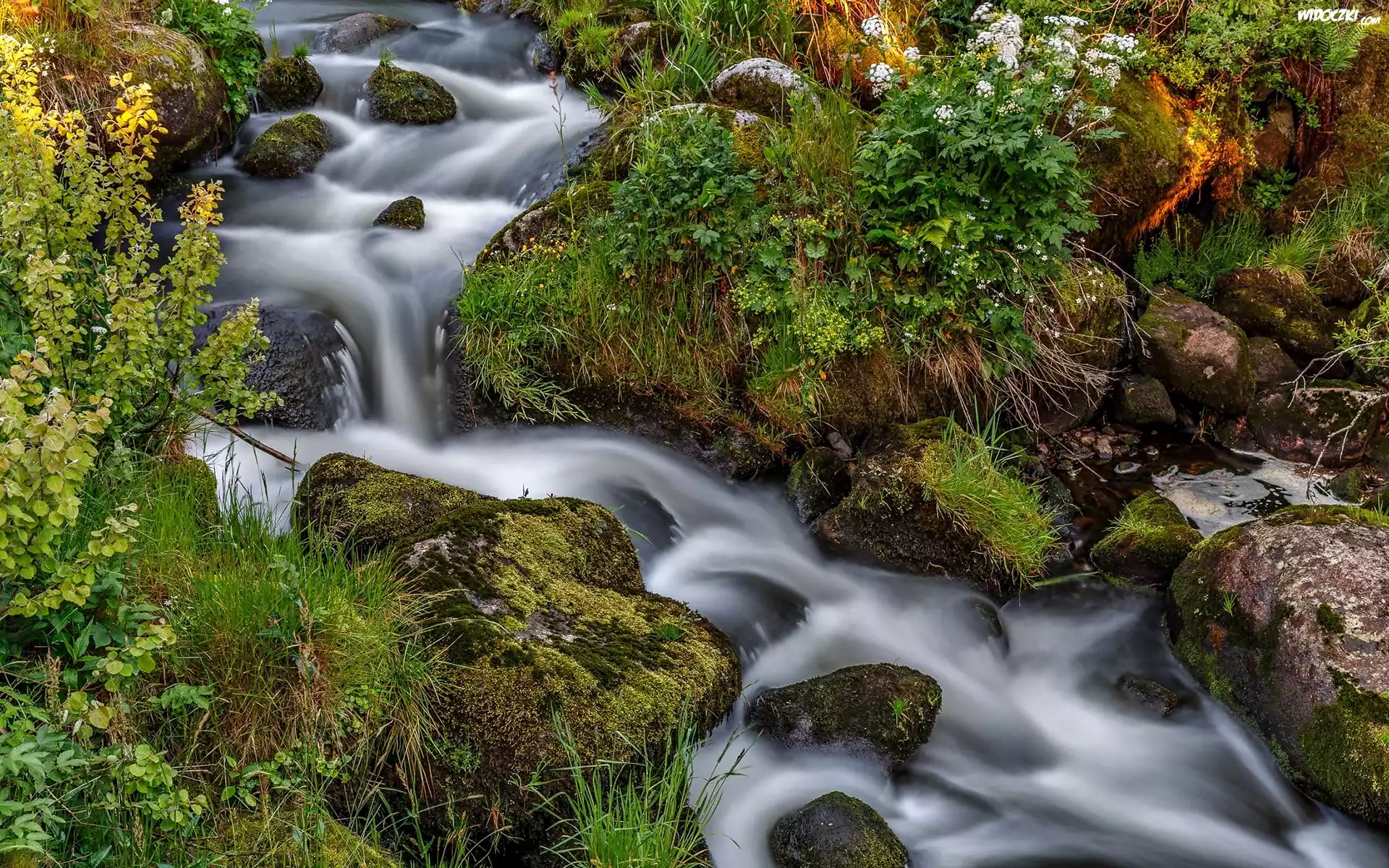 Zdjęcia, Potok, Rzeczka, Omszałe, Kamienie, Kwiaty