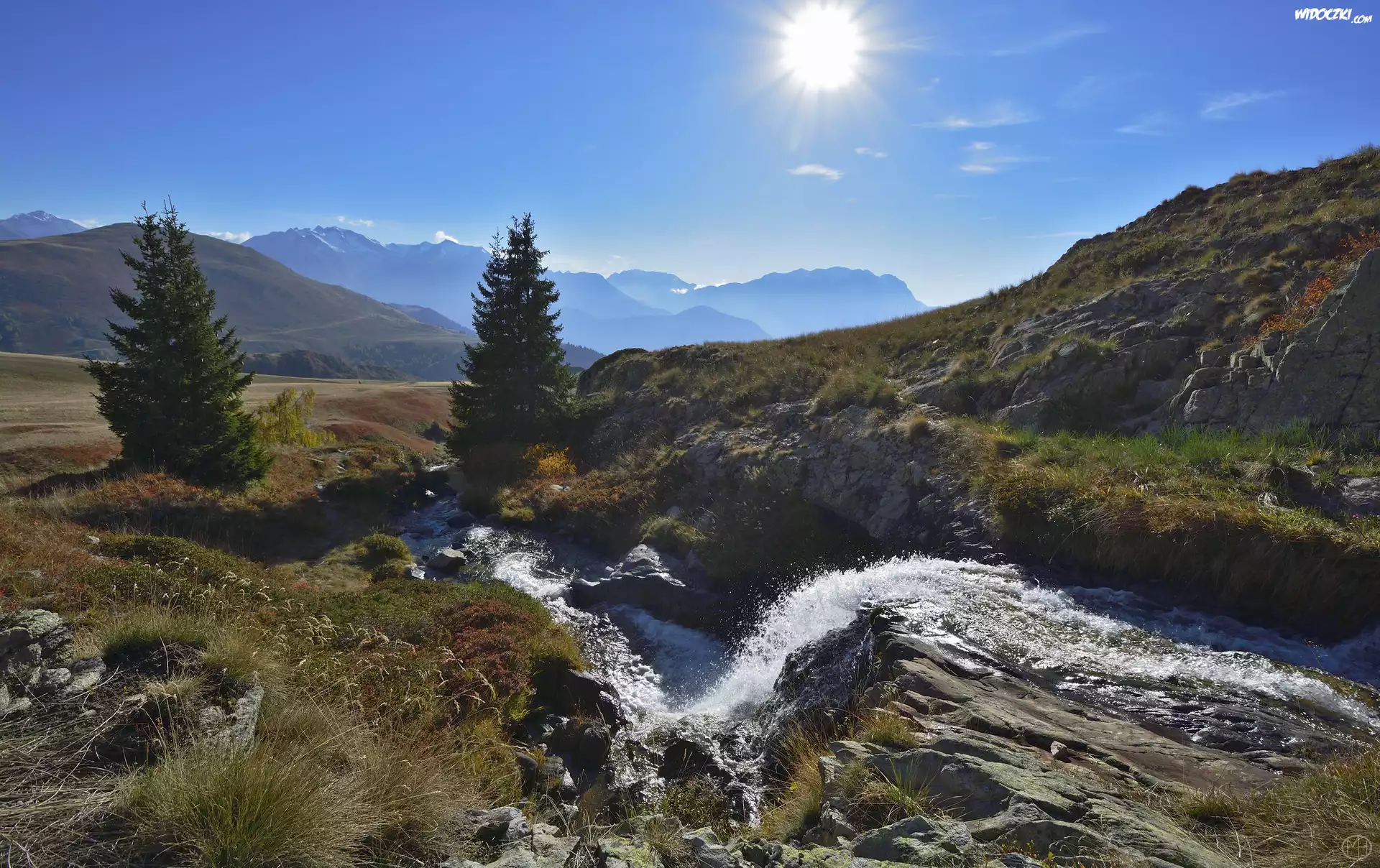 Góry, Potok, Kamienie, Drzewa, Słońce
