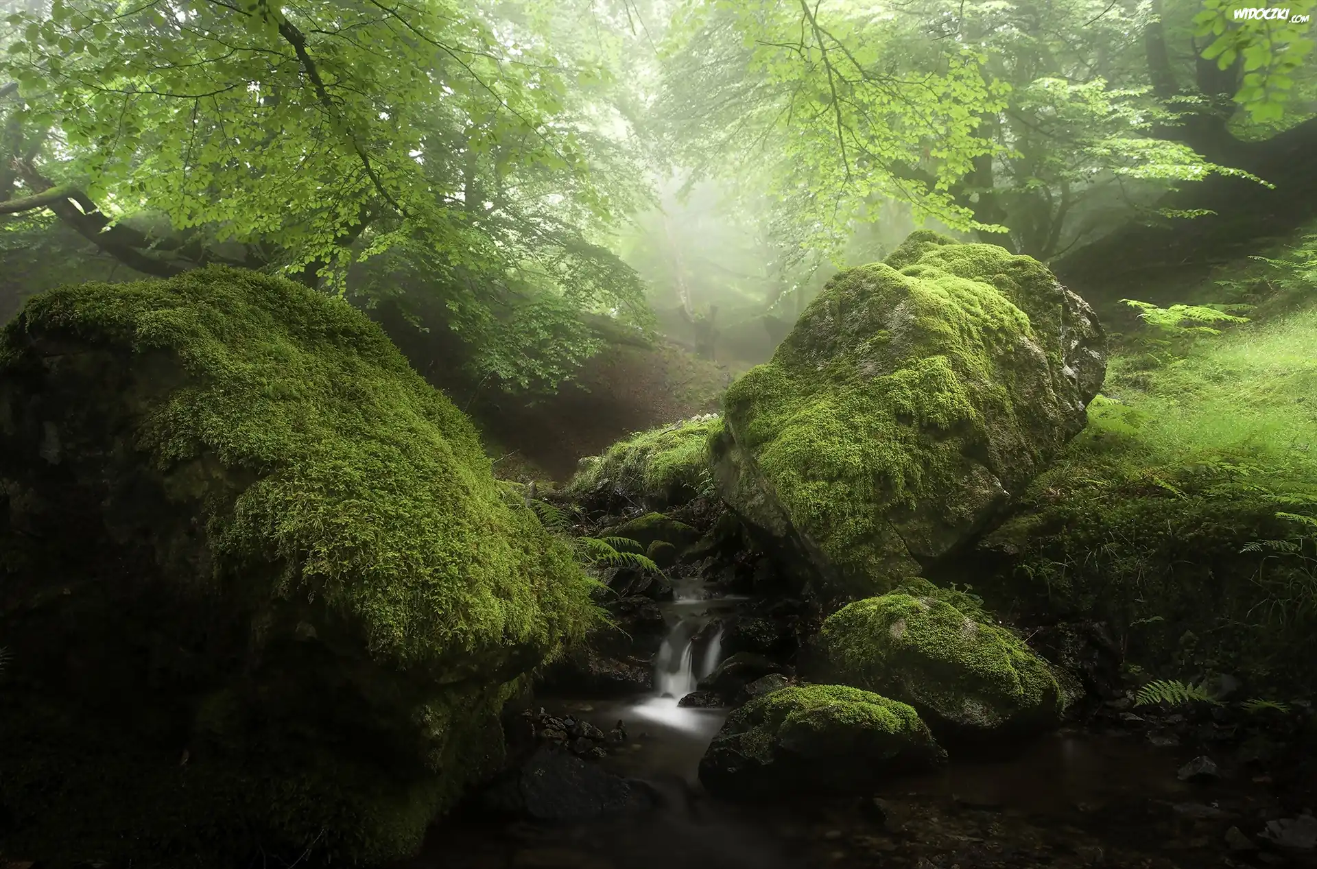 Zdjęcia, Potok, Omszałe, Skały, Mgła, Drzewa