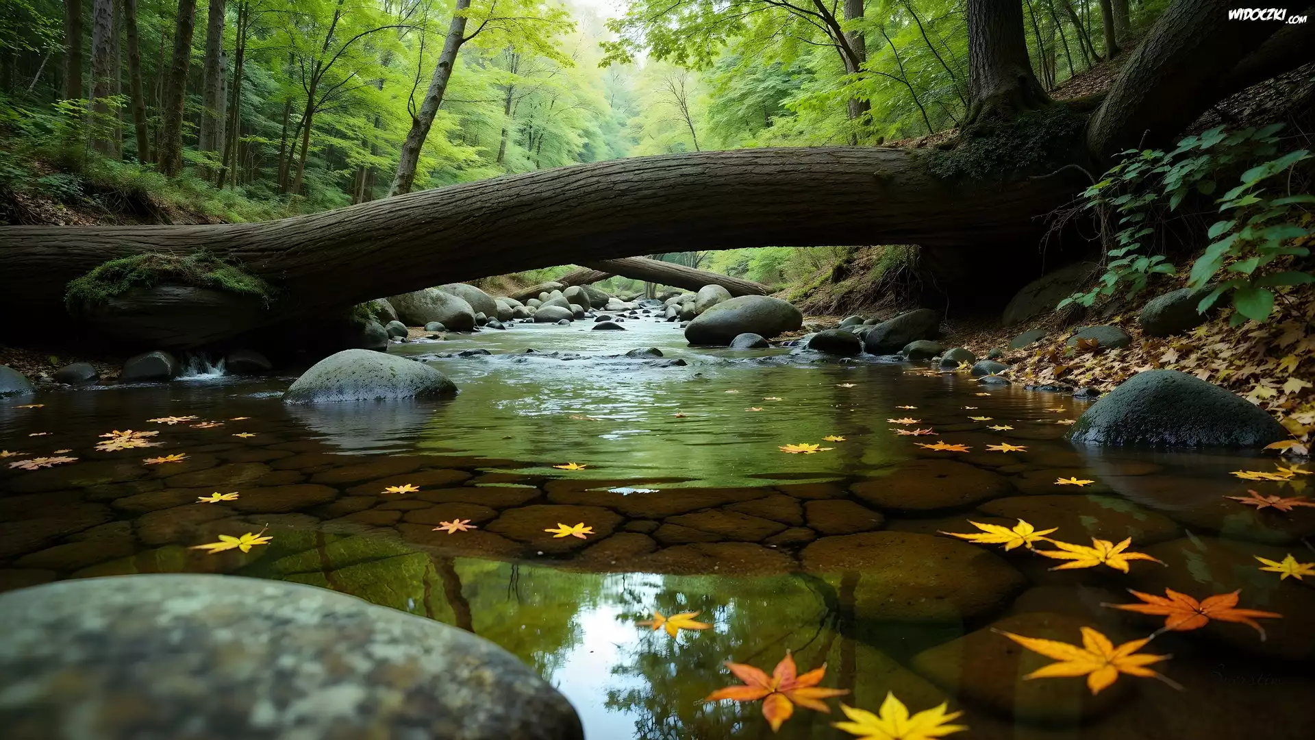 Zdjęcia, Las, Potok, Powalone, Drzewo, Liście