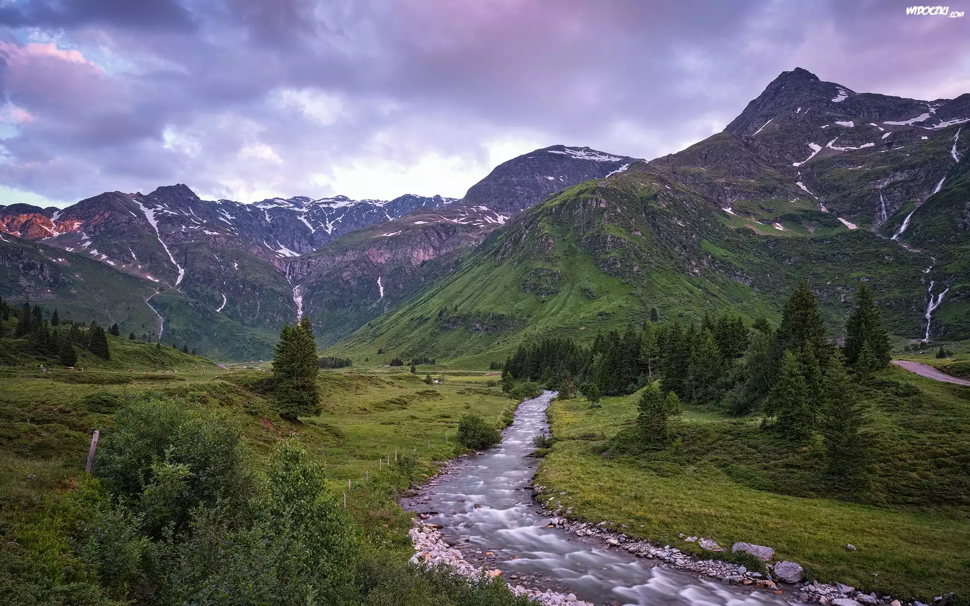 Zdjęcia, Góry, Potok, Rzeka, Drzewa, Chmury