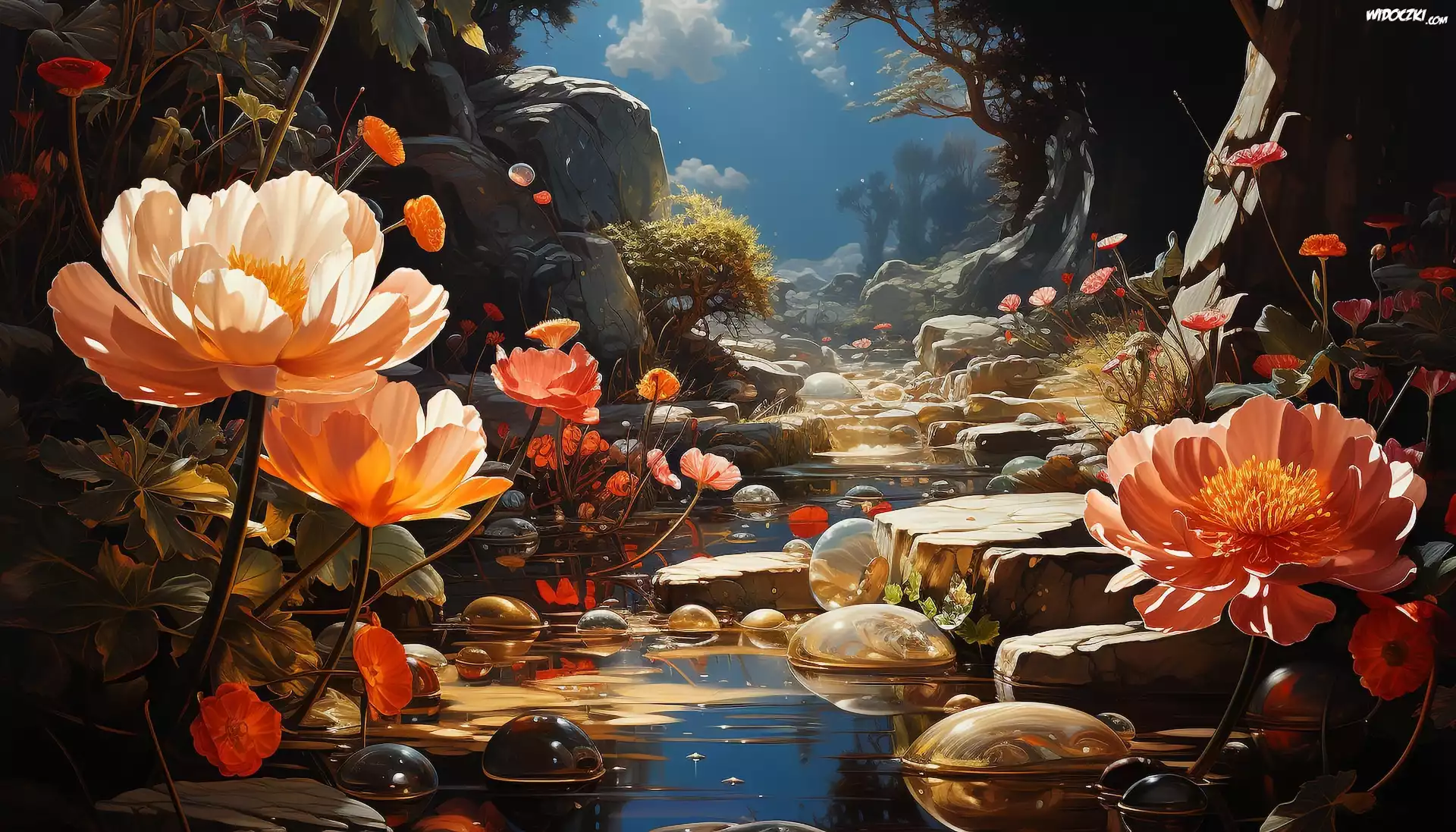 Kwiaty, Kolorowe, Grafika, Potok, Kamienie, Skały