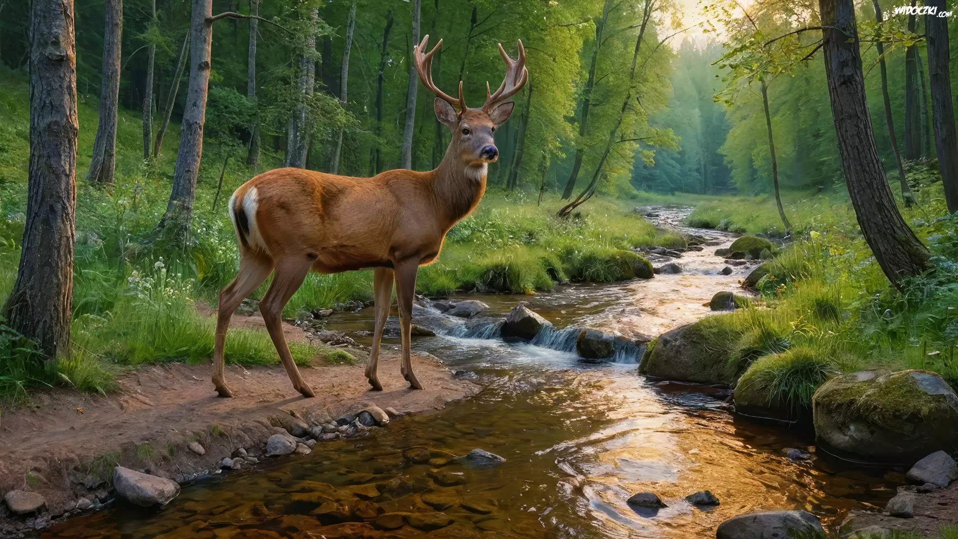 Zdjęcia, Jeleń, Las, Drzewa, Potok, Kamienie, Trawa