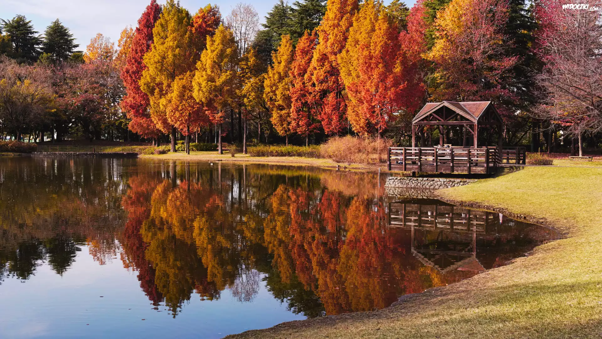 Zdjęcia, Jesień, Jezioro, Las, Pożółkłe, Drzewa, Altana