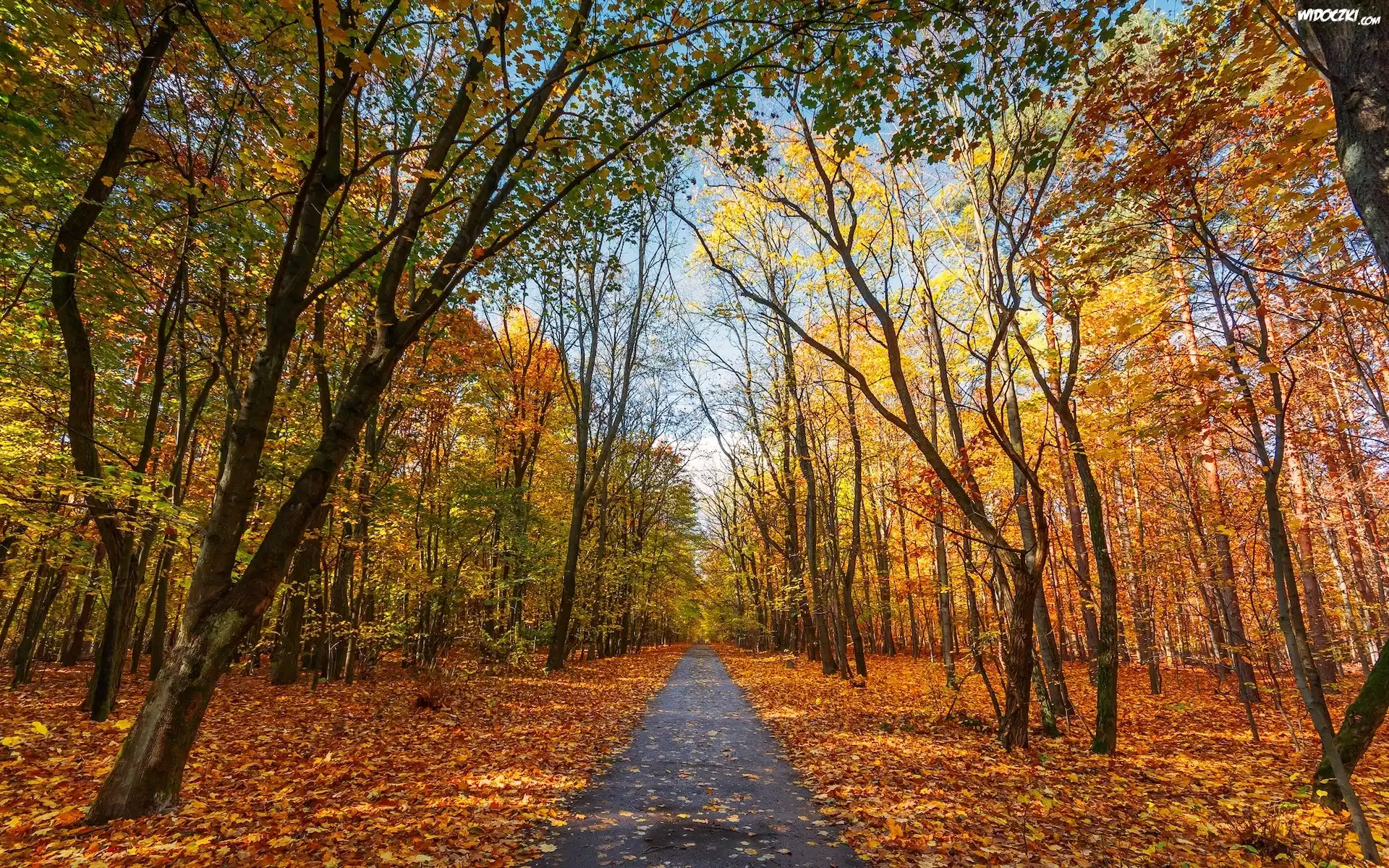 Jesień, Las, Droga, Pożółkłe, Drzewa, Opadłe, Liście
