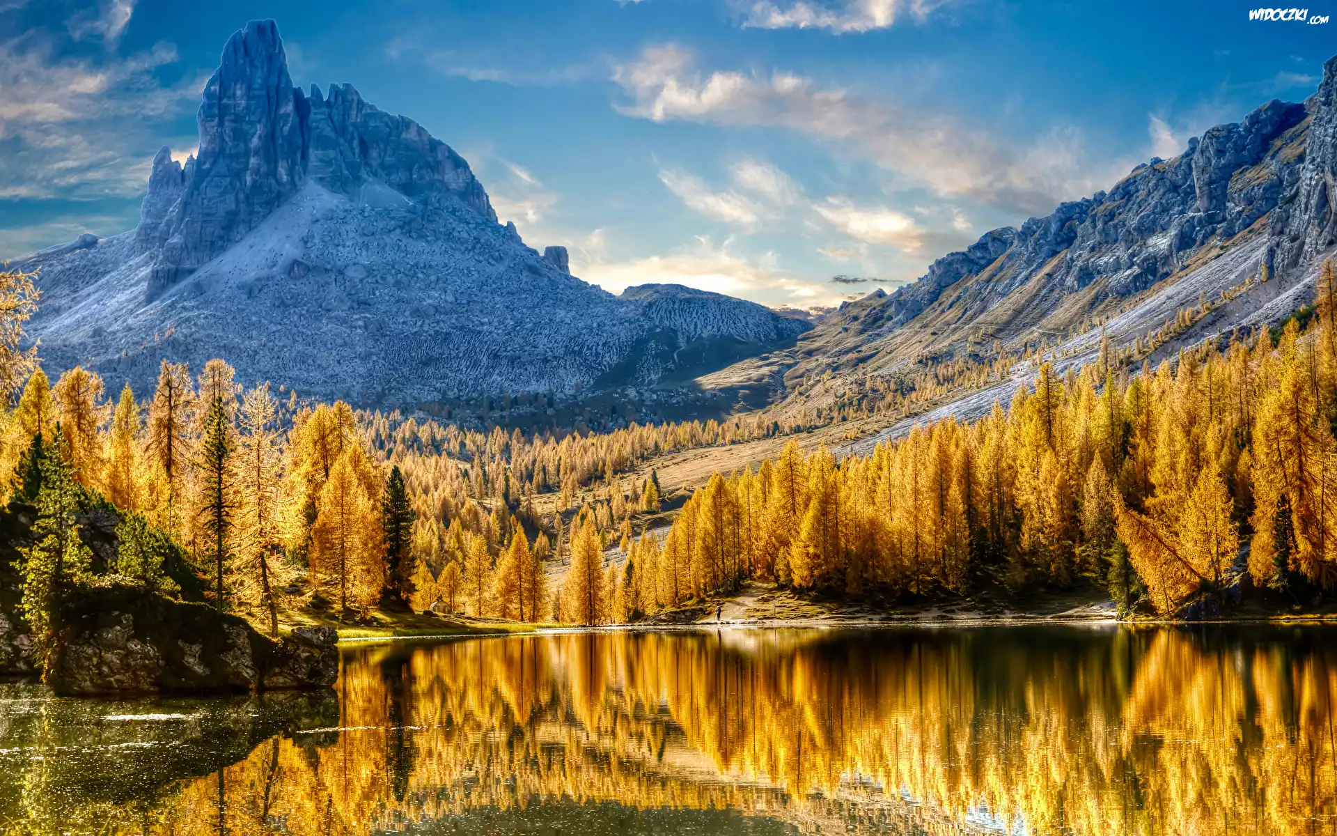 Zdjęcia, Jesień, Góry, Dolomity, Jezioro, Lago Federa, Pożółkłe, Drzewa, Cortina dAmpezzo, Włochy