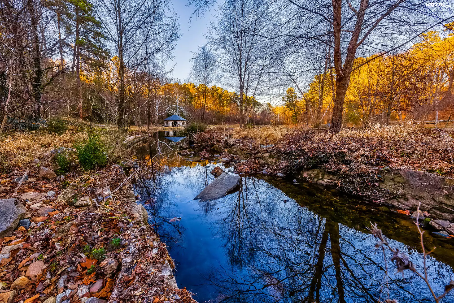 Zdjęcia, Jesień, Rzeka, Domek, Pożółkłe, Trawy, Drzewa