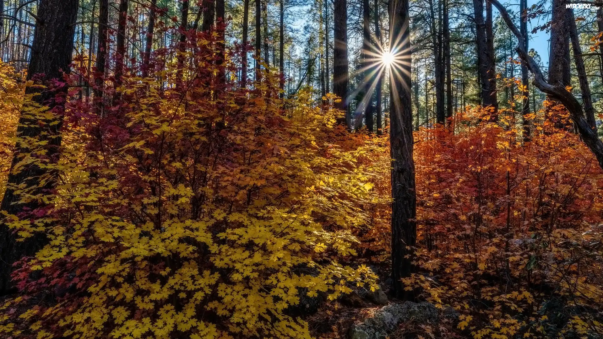 Jesień, Las, Drzewa, Pożółkłe, Liście, Promienie słońca