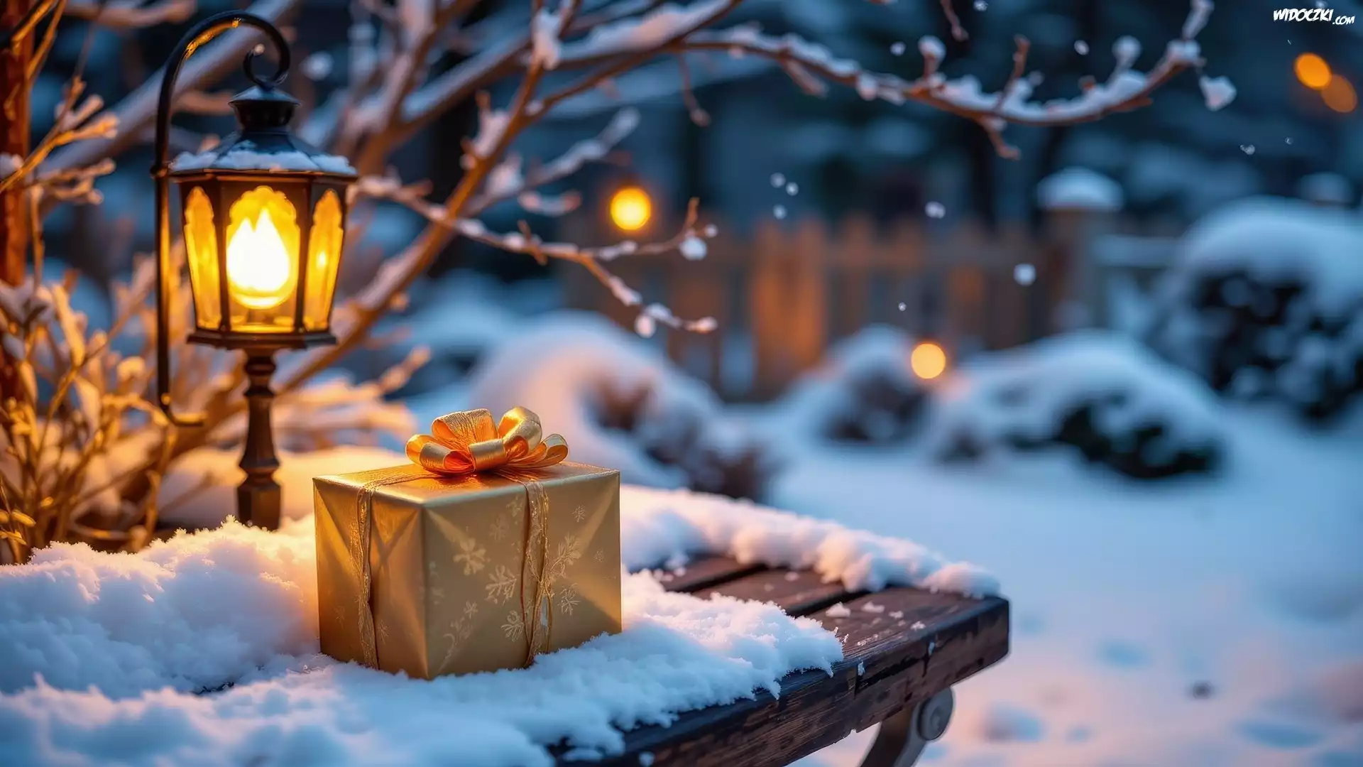 Zima, Śnieg, Ławka, Prezent, Lampa, Gałęzie