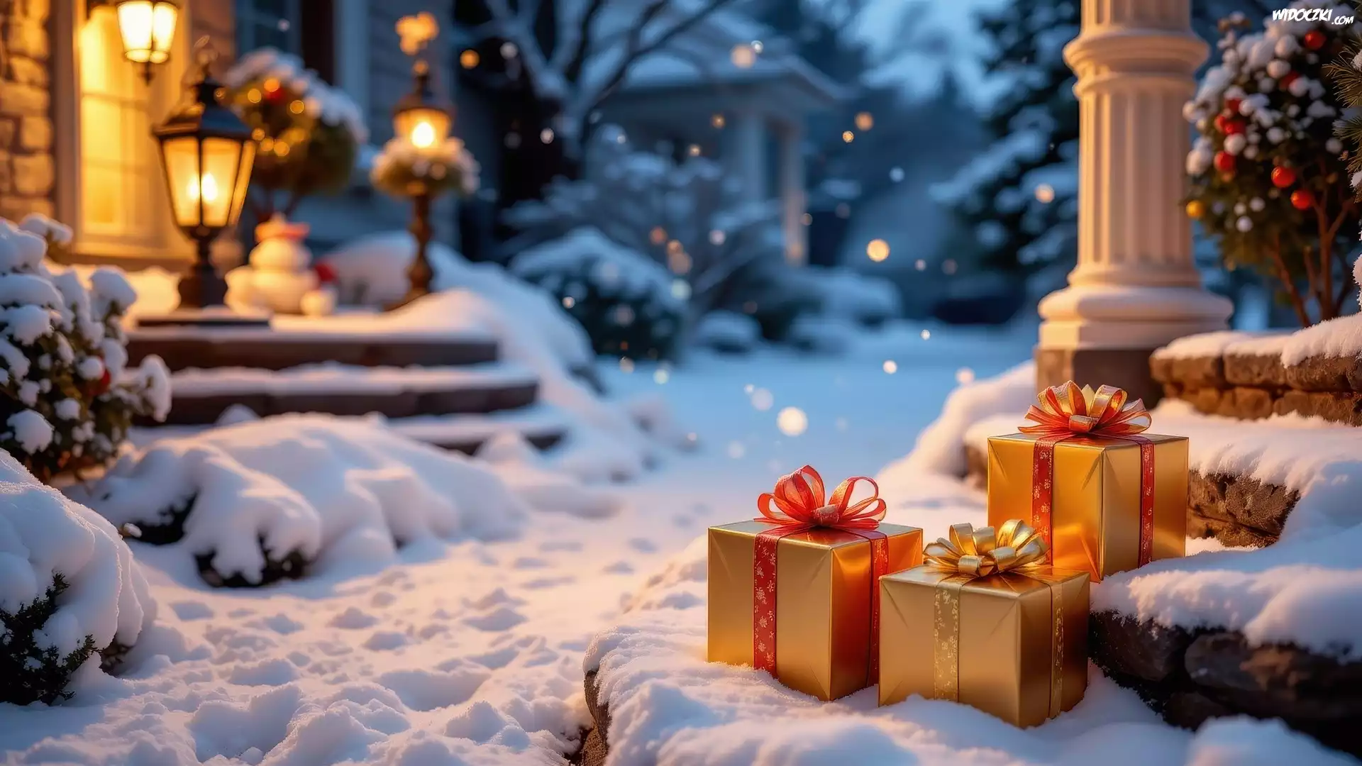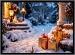 Zima, Ośnieżone, Schody, Prezenty, Krzewy, Bombki