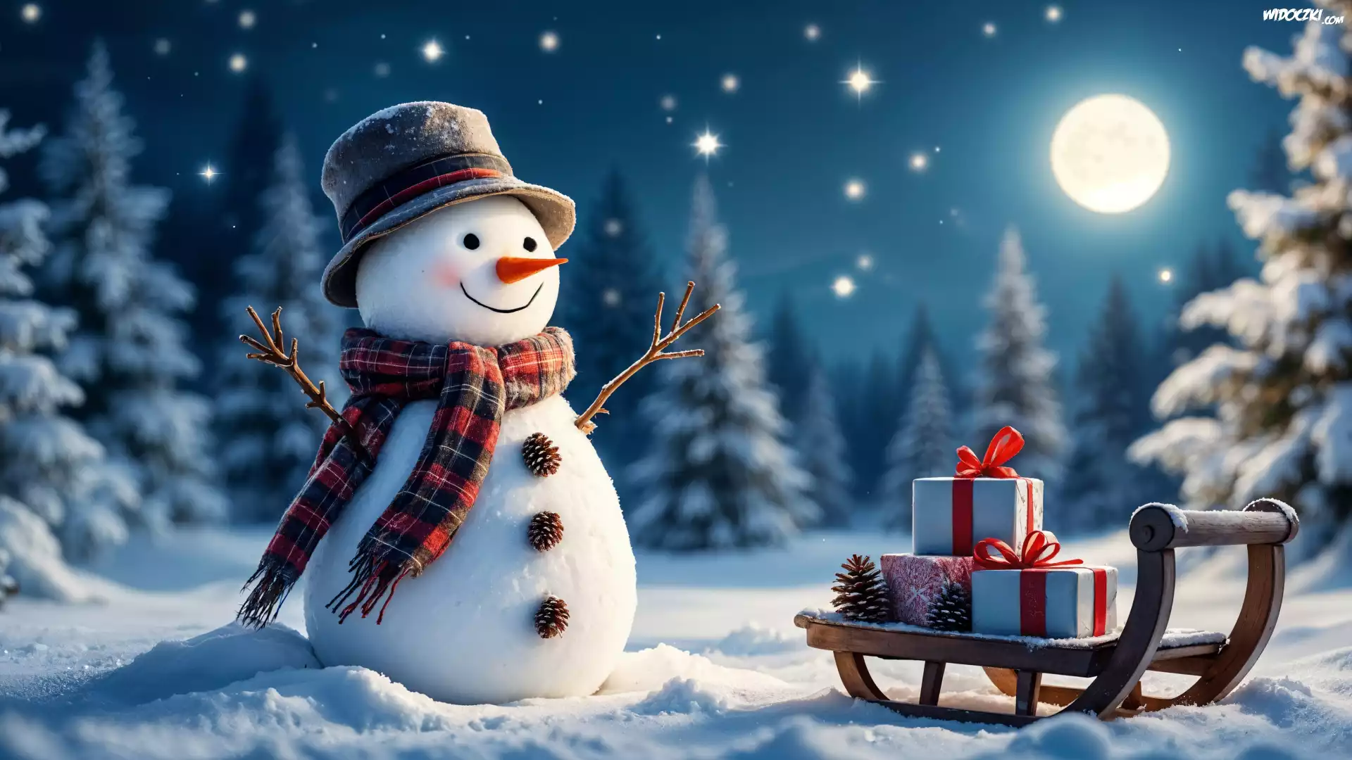 Zdjęcia, Zima, Śnieg, Bałwan, Kapelusz, Szalik, Sanki, Prezenty, Szyszki, Noc, Księżyc, Gwiazdy