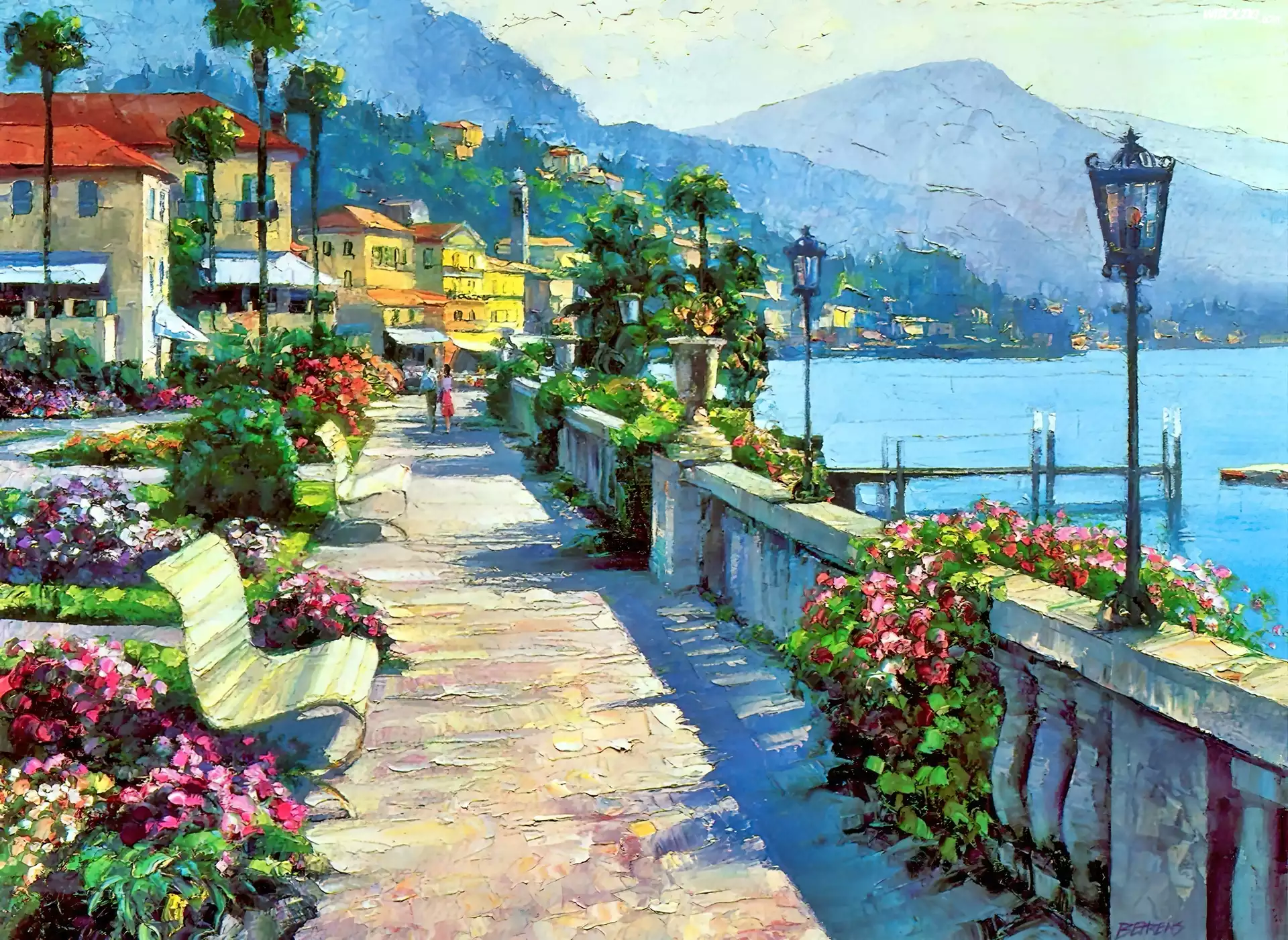 Zdjęcia, Promenada, Ławki, Morze, Domy