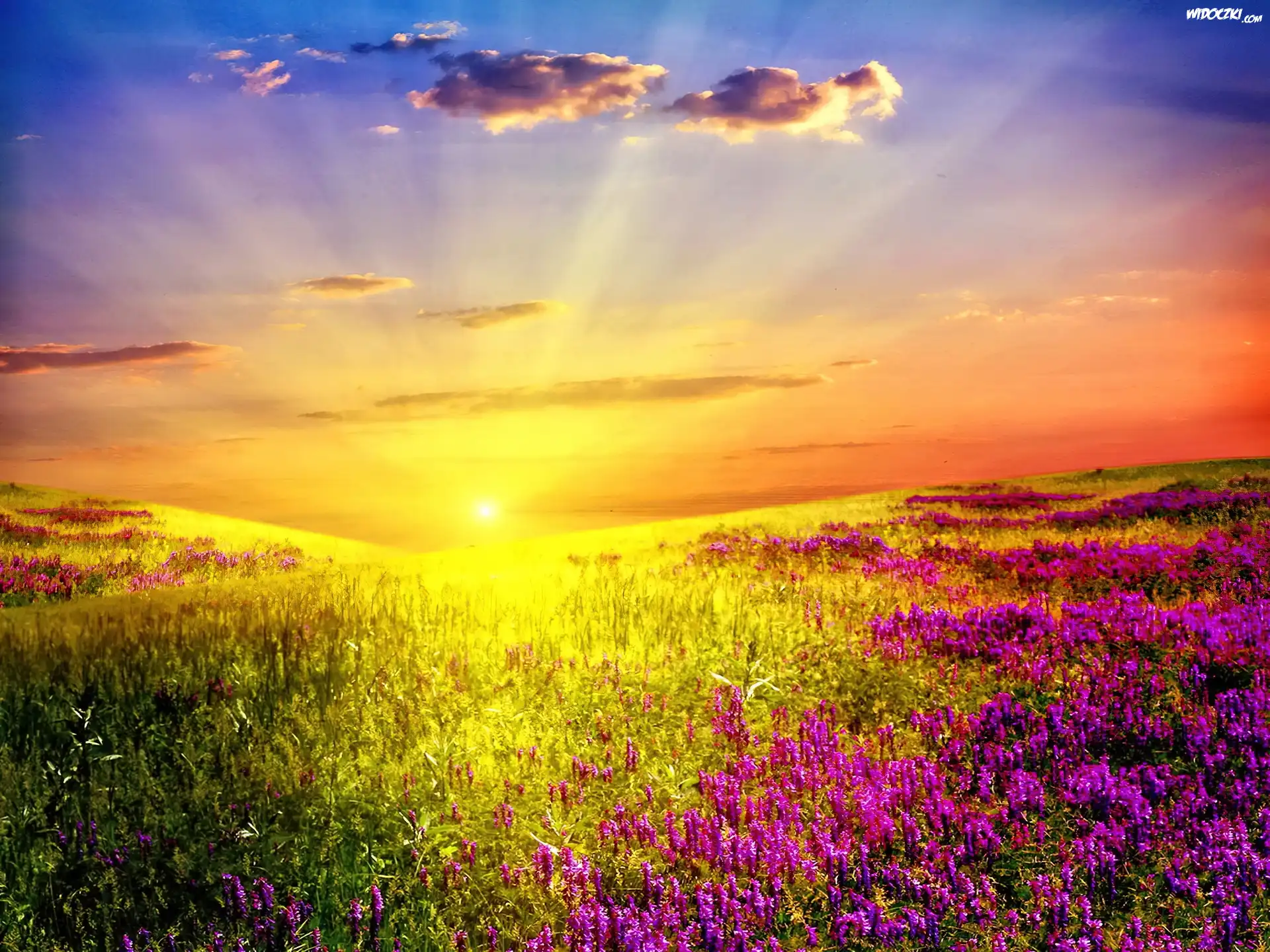 Promienie, Słońca, Łąka, Kwiaty