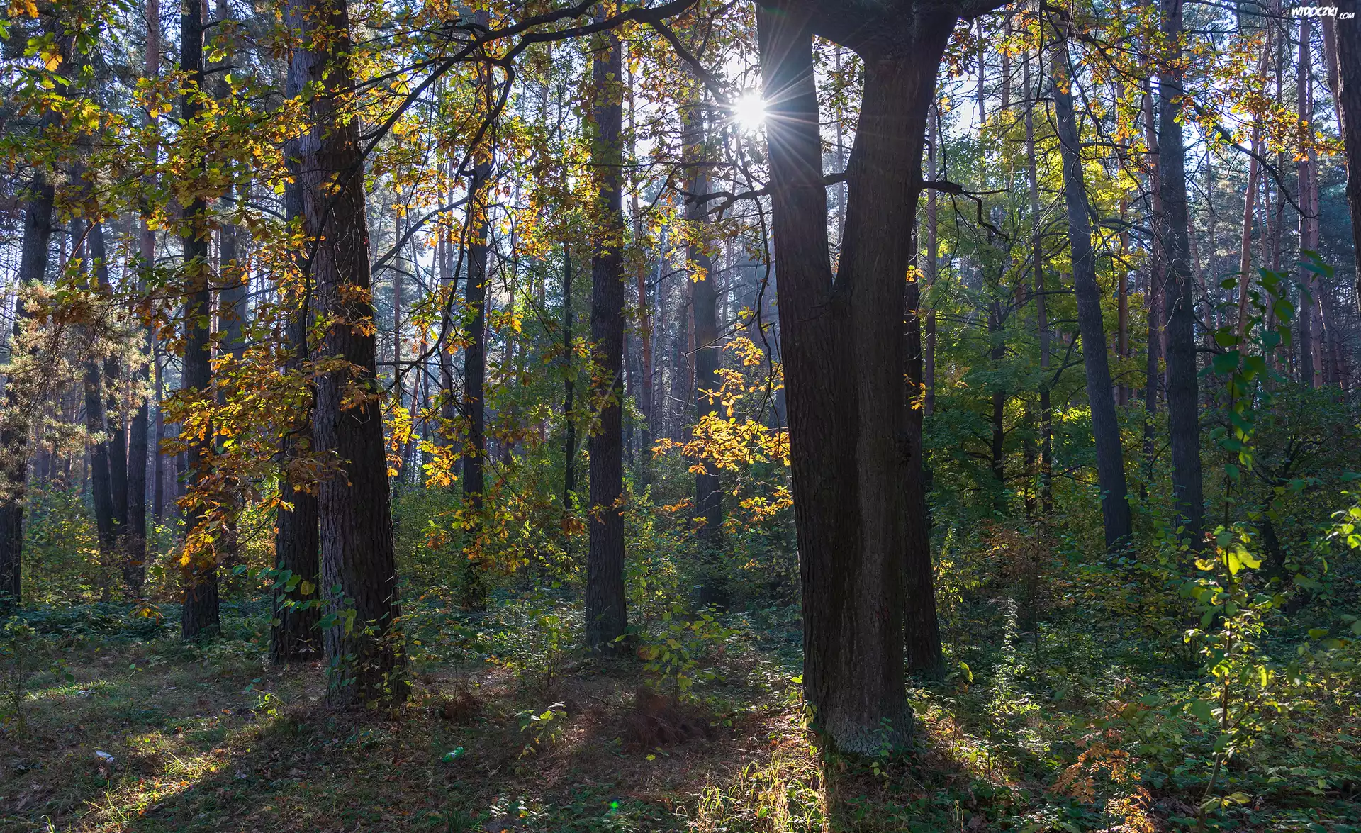 Promienie słońca, Las, Drzewa, Rośliny