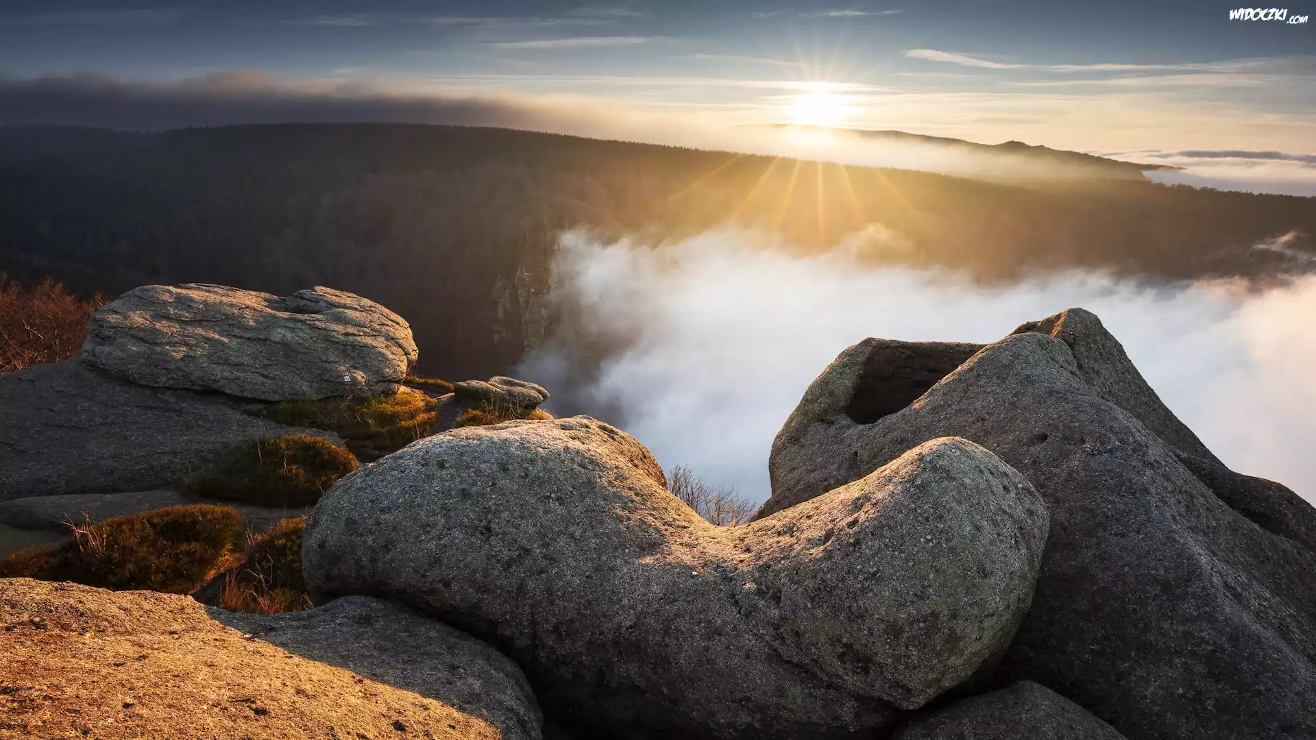 Promienie słońca, Góry, Skały, Głazy, Mgła