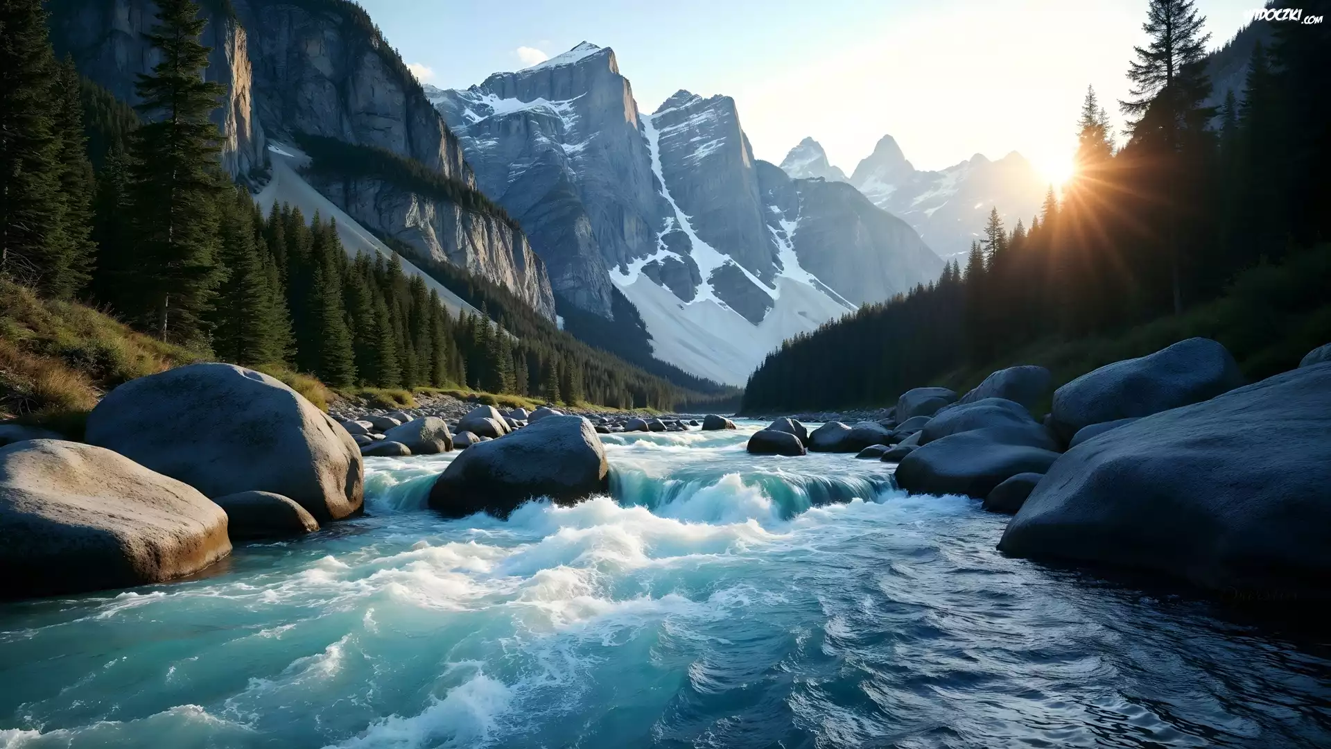 Rzeka, Kamienie, Góry, Promienie słońca, Grafika AI