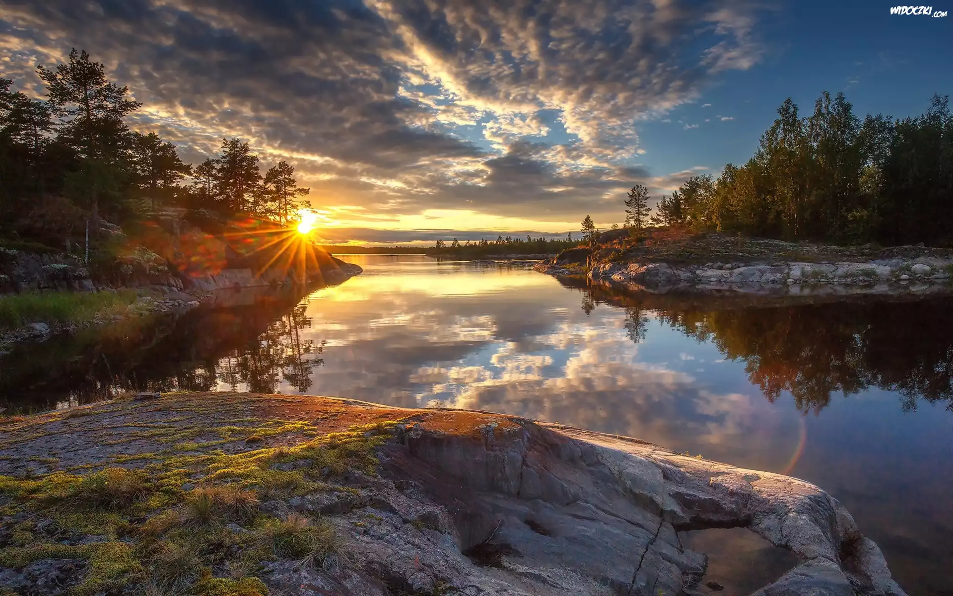 Zdjęcia, Promienie słońca, Rzeka, Kamienie, Drzewa