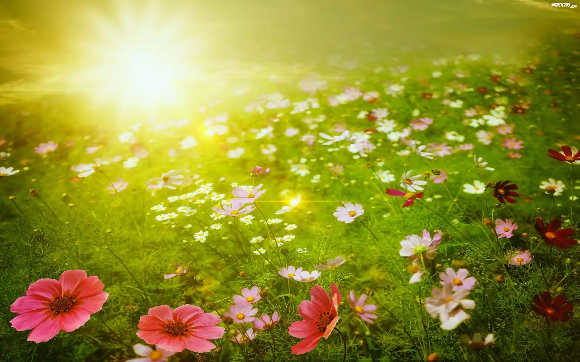 Zdjęcia, Łąka, Kwiaty, Promienie, Słońca