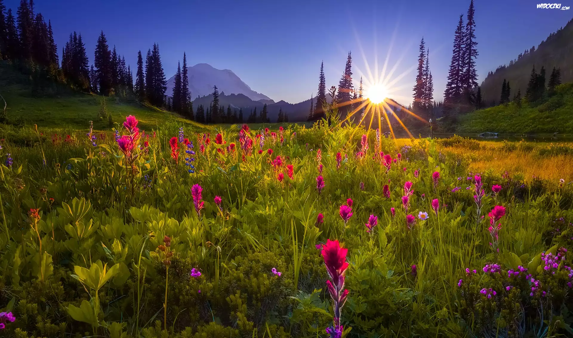 Zdjęcia, Łąka, Kwiaty, Góry, Promienie słońca