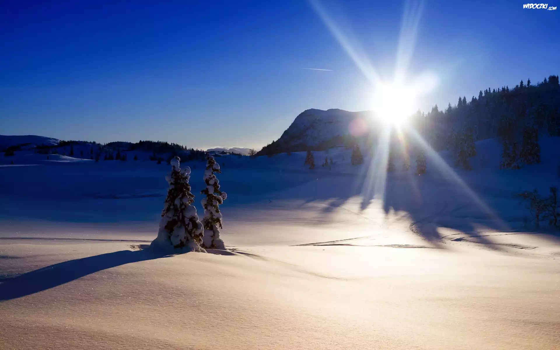 Promienie, Słońca, Drzewa, Śnieg, Zima