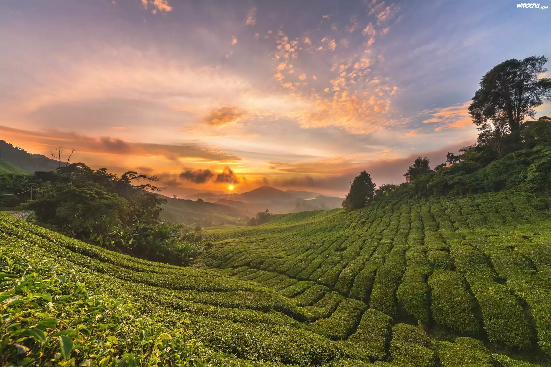 Plantacja, Wzgórza, Drzewa, Krzewy, Chmury, Promienie słońca, Cameron Highlands, Stan Pahang, Malezja |