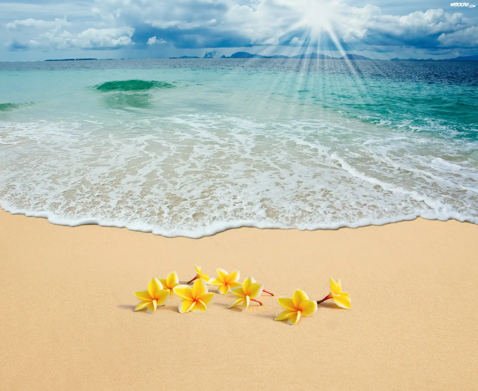 Zdjęcia, Promienie, Słońca, Morze, Plaża, Kwiatuszki