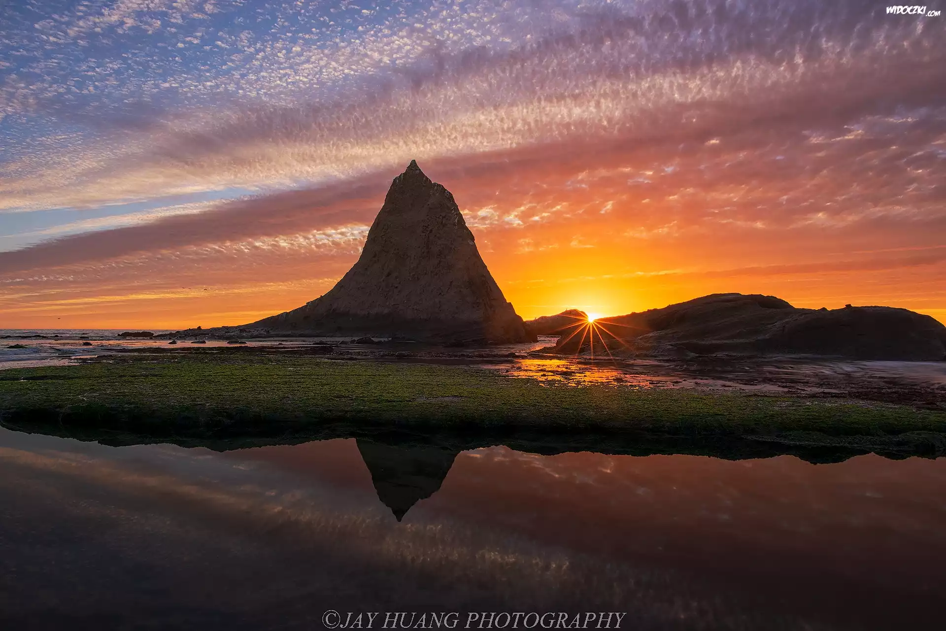 Zdjęcia, Zachód słońca, Promienie słońca, Skały, Morze, San Mateo, Kalifornia, Stany Zjednoczone