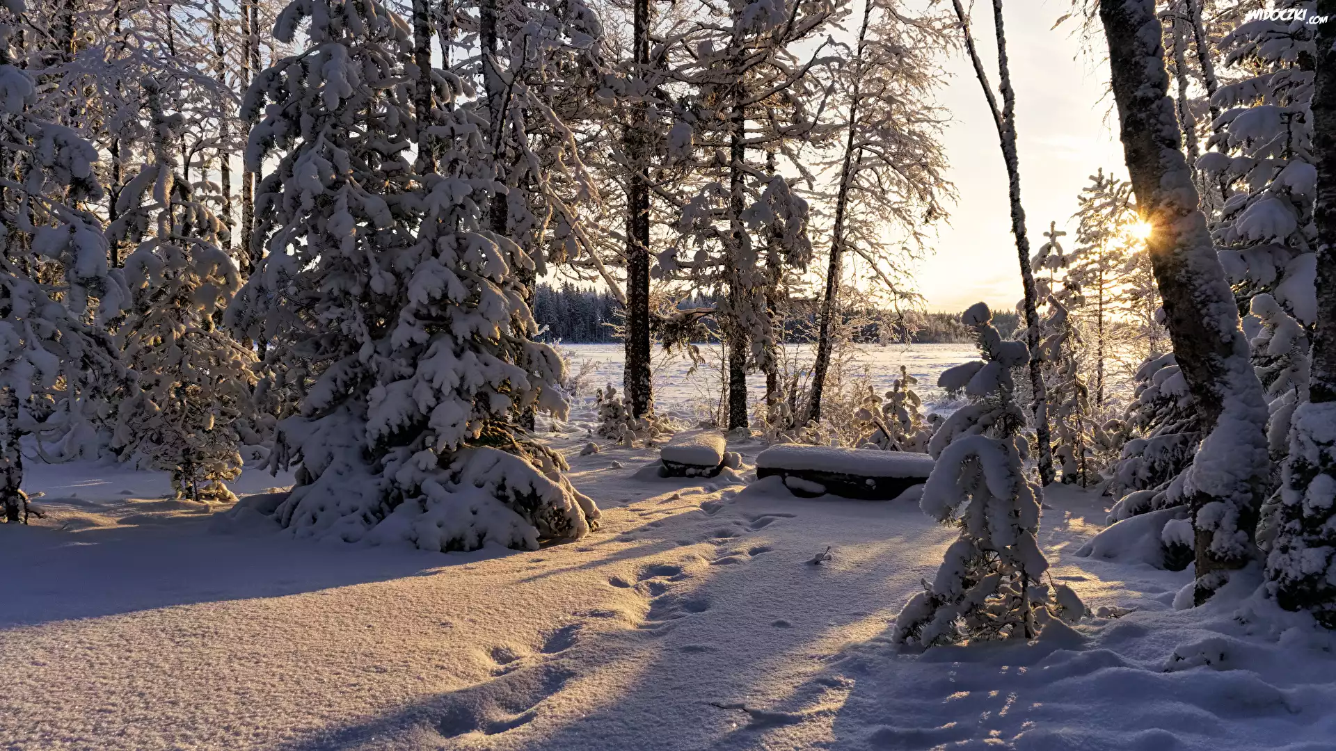 Zdjęcia, Zima, Promienie słońca, Las, Ośnieżone, Drzewa, Świerki