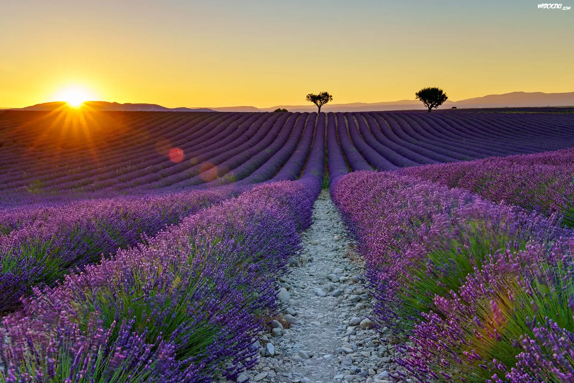 Zdjęcia, Francja, Prowansja, Valensole, Pole, Lawenda, Zachód słońca, Drzewa