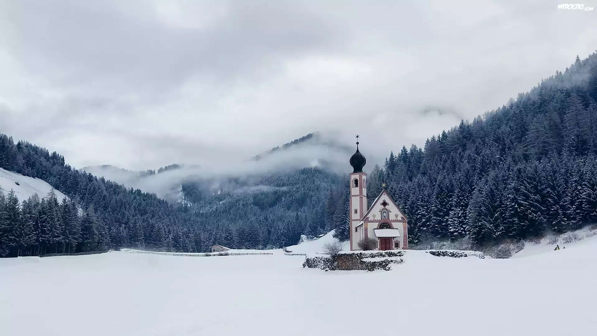Włochy, Prowincja Bolzano, Rejon Trydent-Górna Adyga, Dolina Val di Funes, Kościół św. Jana, Dolomity, Zima, Mgła, Góry, Las, Drzewa |