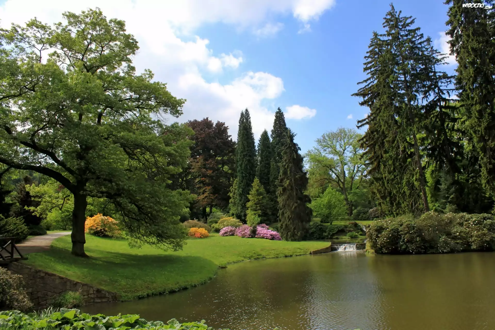 Zdjęcia, Pruhonice, Park, Staw, Przebijające, Światło