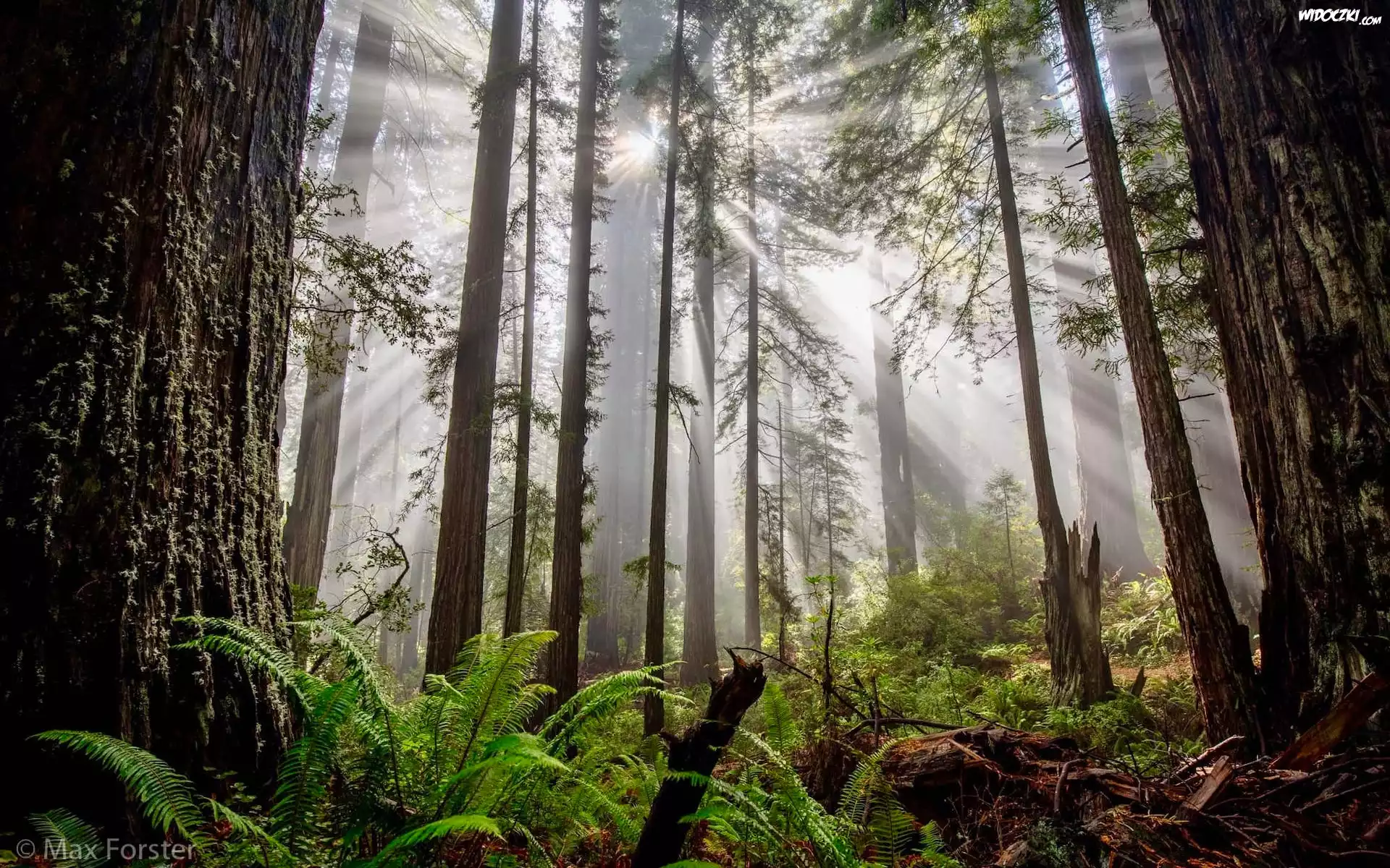 Zdjęcia, Las, Drzewa, Paprocie, Przebijające światło, Mgła