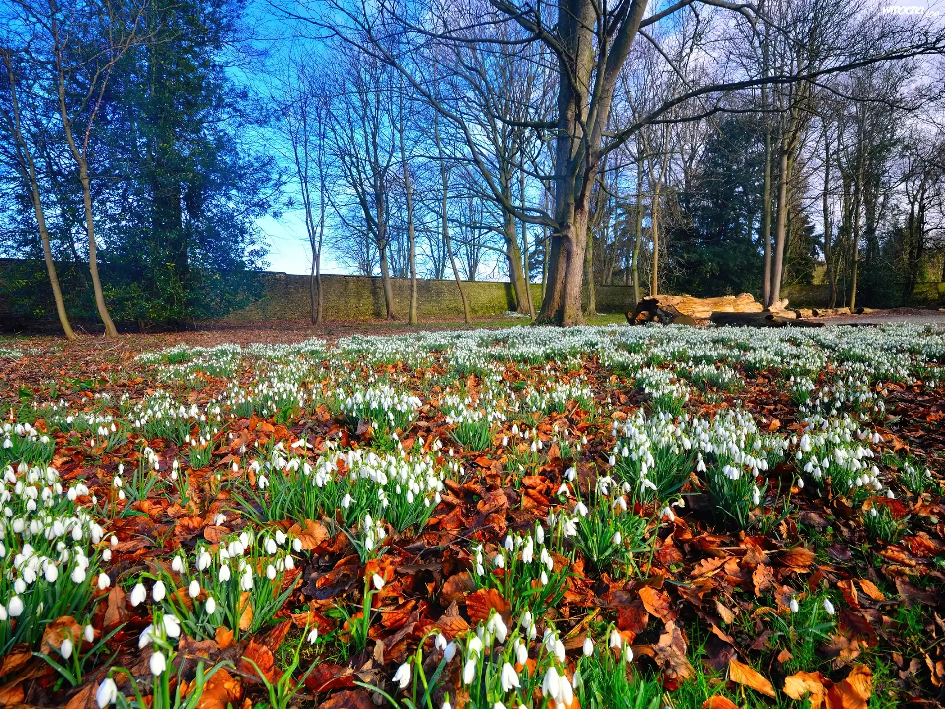 Zdjęcia, Łąka, Przebiśniegi, Drzewa