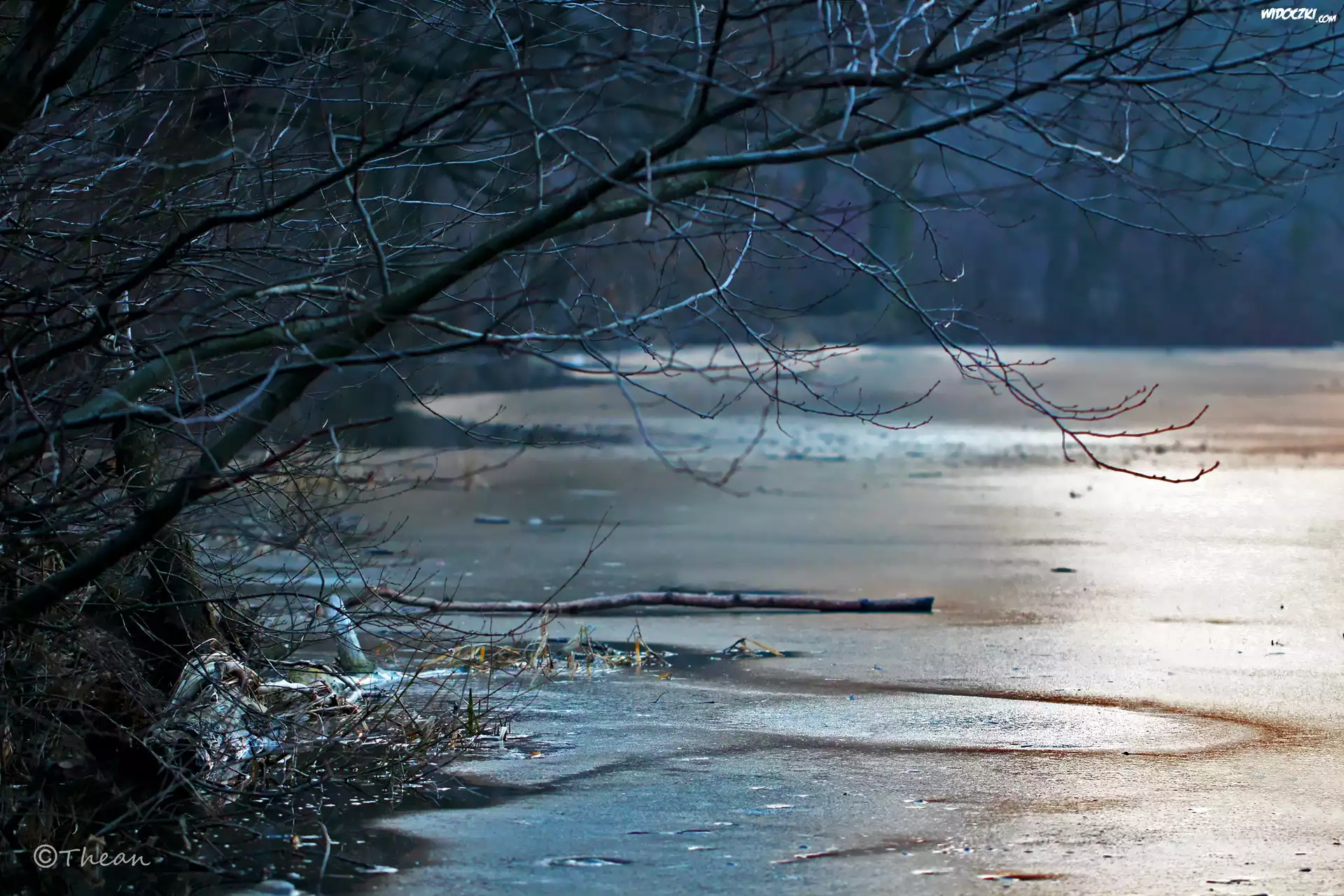 Zdjęcia, Przedwiośnie, Jezioro, Drzewa, Lód
