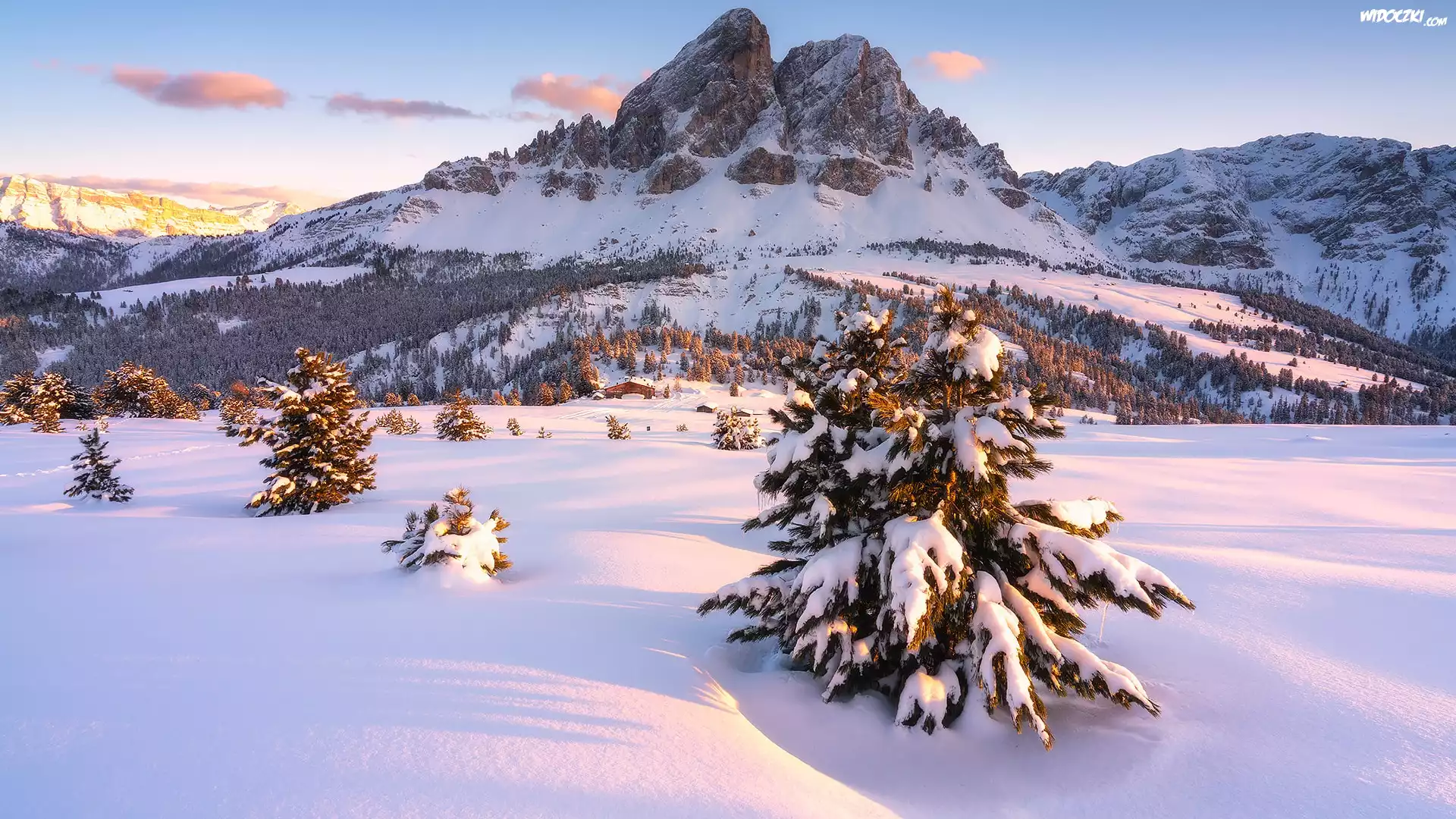 Góry, Dolomity, Góra Peitlerkofel, Przełęcz, Passo delle Erbe, Śnieg, Drzewa, Zima, Południowy Tyrol, Włochy |