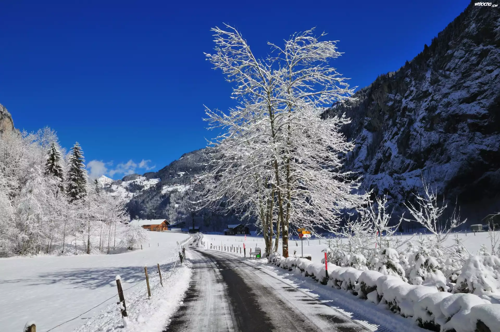 Przydrożne, Domy, Drzewa, Góry, Alpy, Zima