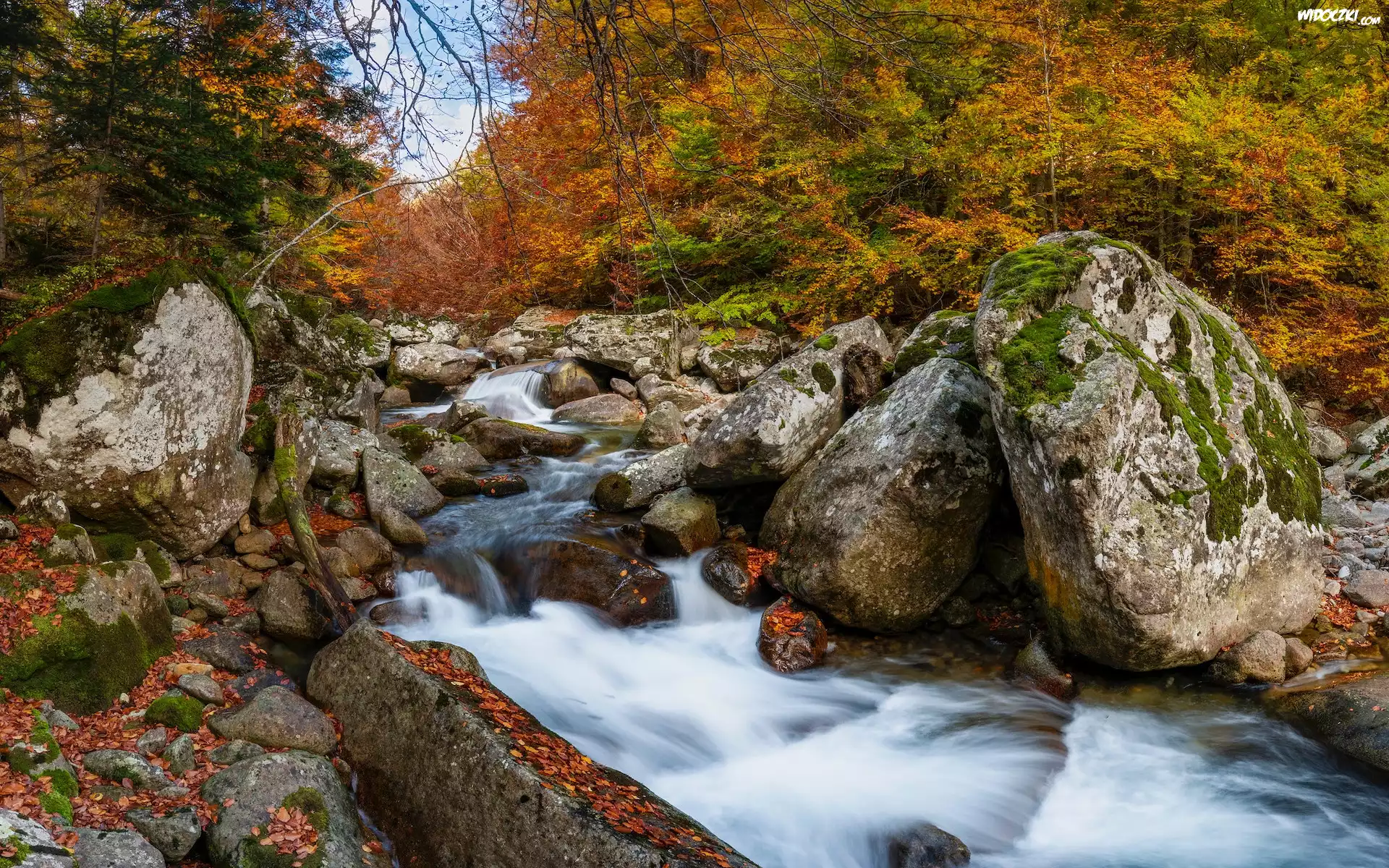 Hiszpania, Aragonia, Rezerwat przyrody, Posets Maladeta, Drzewa, Rzeka, Rio Ara, Kamienie, Skały, Jesień |