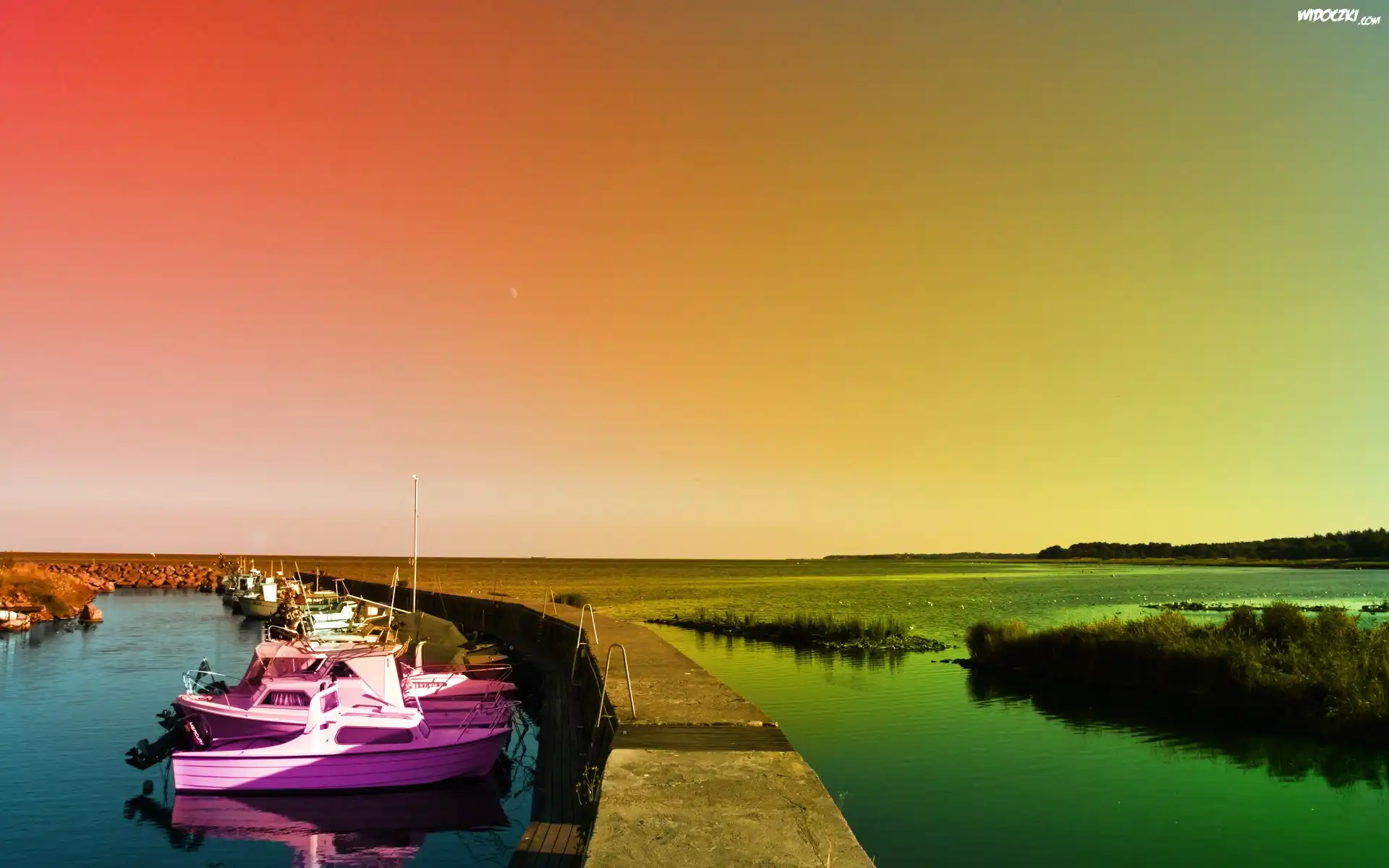 Zdjęcia, Przystań, Motorówki, Zachód, Słońca, Jezioro