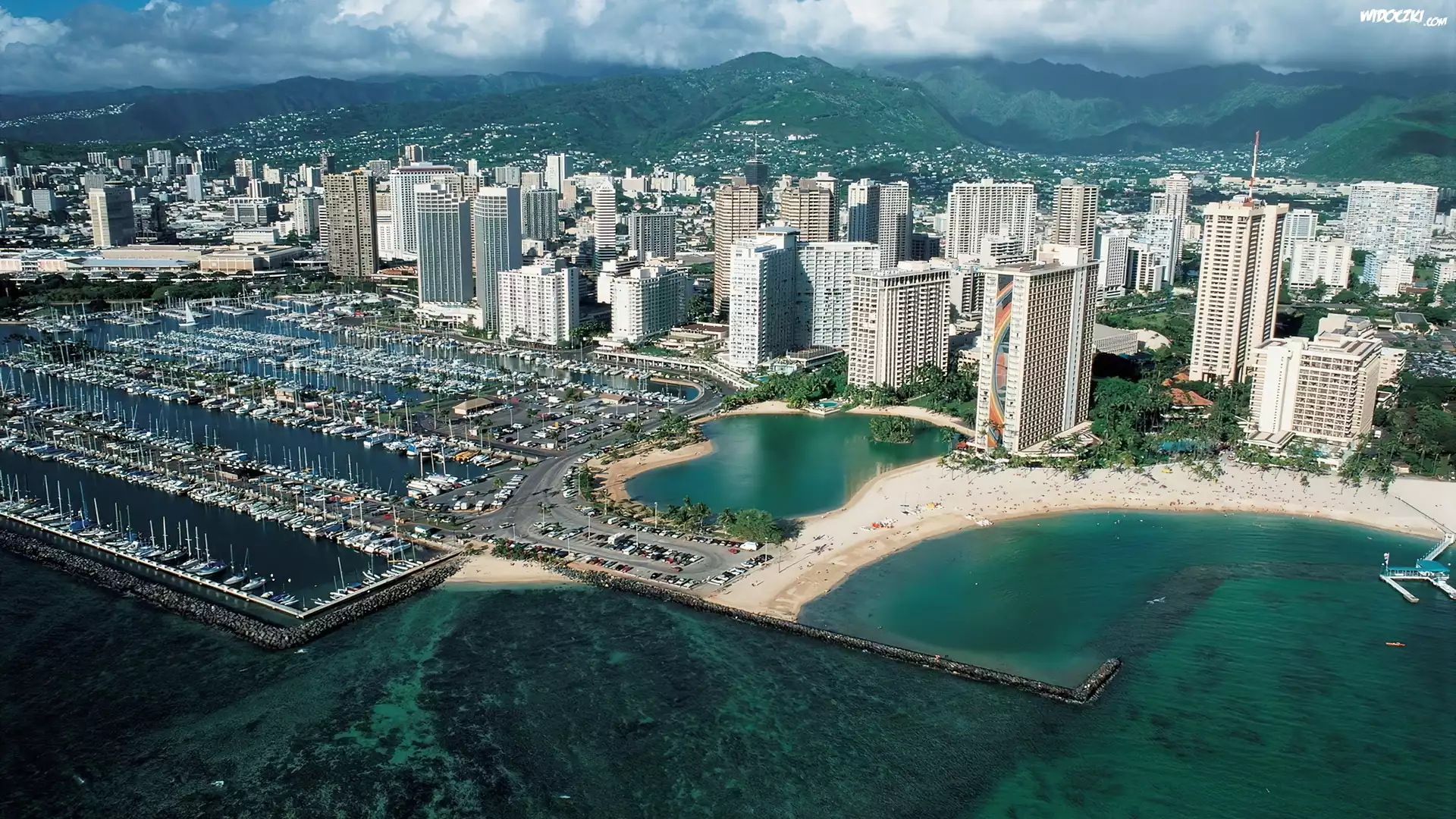 Zdjęcia, Przystań, Jachty, Wieżowce, Plaża