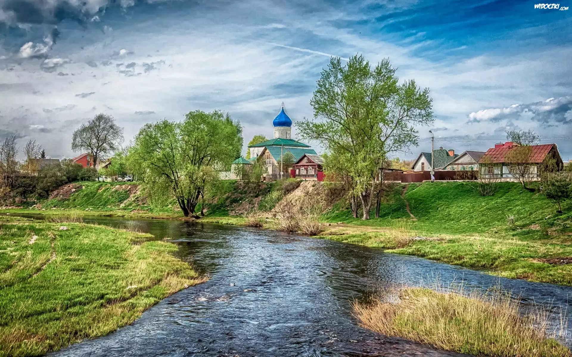 Psków, Cerkiew, Rzeka, Drzewa, Domy
