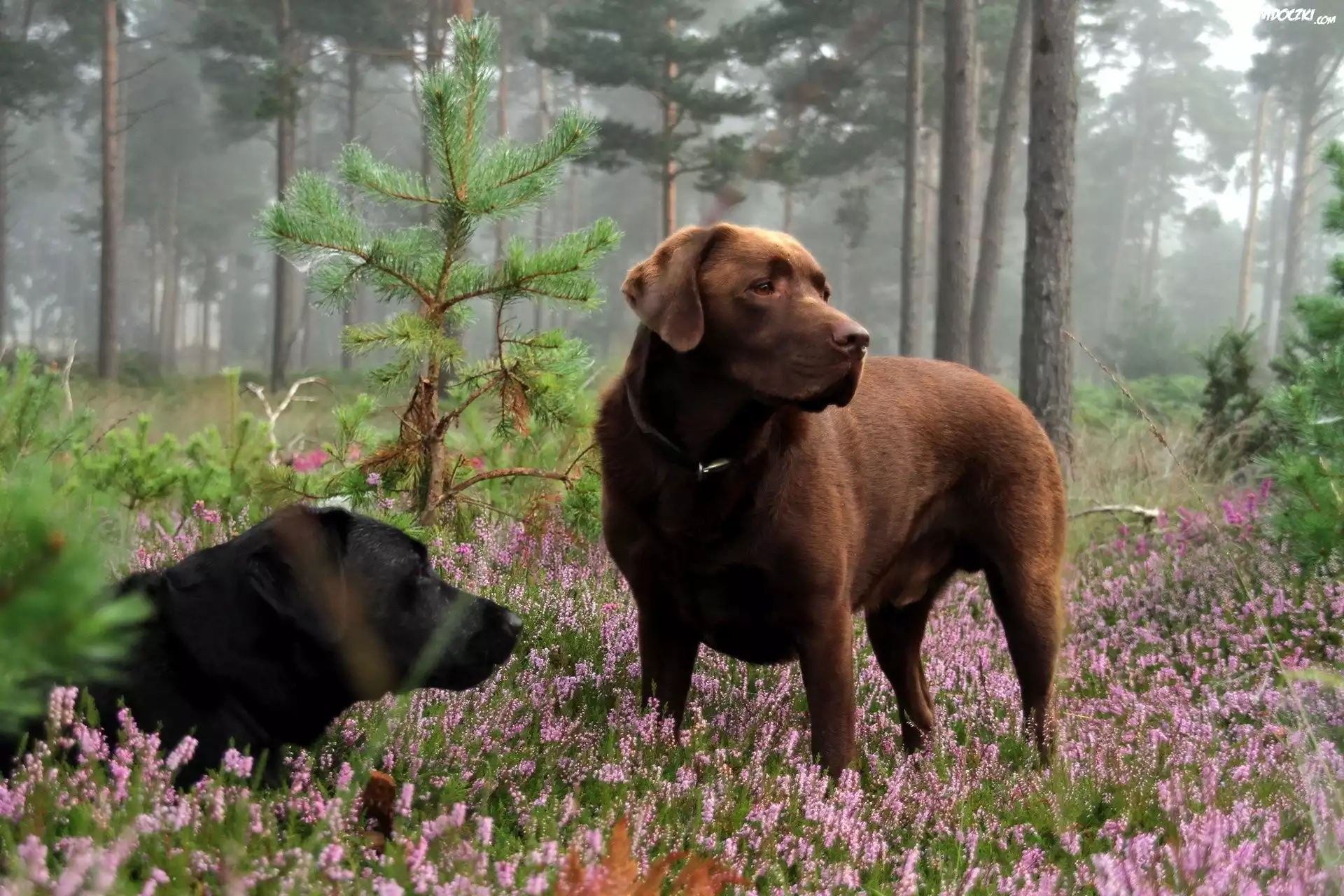 Zdjęcia, Psy, Las, Sosny, Polne, Kwiaty